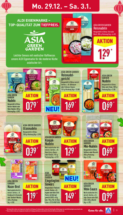 Bitte beachten Sie, dass dieser Text automatisch generiert wird und möglicherweise Fehler enthältAE FS ALDI EIGENMARKE - AR UDELN Per TOP-QUALITÄT ES ze ASIA CARDEN ve, Leichter Genuss mit exotischer Raffinesse: L D 1 unsere ALDI Eigenmarke für die moderne Küche asiatischer Art. > Fe Era rie dn Ast ASIA GREEN GARDEN EX Reisnudel- ASIA GREEN eN LUN GARDEN JDELN ed gericht ia A Hergestelltin China; versch. Nudeln MIR, Sorten, z. B. Süfsauer Hergestelltin China ‚oder Erdnuss-Sauce; Udon oder Soba: 300-9 war 132-g-Packung (kg = 12.80) 5 Packung (kg =2.30) ASIA GREEN RDE! = Nudeln et Hergestel in China Ramen-Nudeln oder 1 Udon-Nudeln; I LA | ) @ | " 1 Packung lg =395) eme ZE ASK a Se ASIA GREEN GARDEN RU Glasnudeln à MENEN Hergestelltin China > 100-g-Packung (kg = 3.90) ur F ASIAGREEN GARDEN = el Konjak- zagen Nudeln Nach asiatischer Art: Mo- NE | versch. Sorten, z. B. Hergestellt in China E Cl vost hy Rote Curry-Sauce, ) Vollkorn oder Klassik: 07 oder Kimchi: 192-ç- h 250-9-Packung | Packung (kg = 6.72) (kg=276) Fi De m—- FA BR | F | ASIA 4 icn Z GREEN = = GARDEN + 2 ASIA GREEN Eingelegtes Gewürz GARDEN ASIA GREEN Naan-Brot Hergesteltin Thailand: Nach asiatischer Art; versch. Sorten, z B. Wok-Sauce versch. Sorten,z.B. Ingwer oder Rote-Chil Nach asiatischer Art; Knoblauch & Koriander Paste: mit Abtropf- A versch. Sorten, z. B. ‚oder Tandoori Masala; 19 gewicht(ATG)=65g Li 1 Soja-Sesam oder SIR- 97. 240-4-Packung | bzw. 10 g; 106-ml-Glas [ Chi; 200-9-Beutel lj (la=450) (Liter = 2292 ATG/1355) (kg=495)