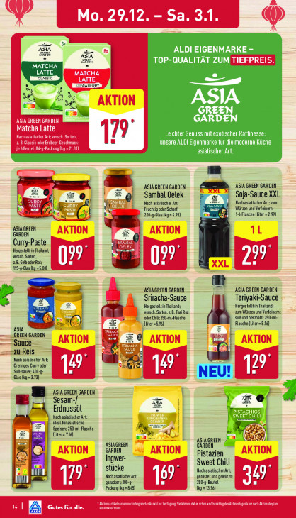 Bitte beachten Sie, dass dieser Text automatisch generiert wird und möglicherweise Fehler enthältBees ASIA ALDI EIGENMARKE - EE Sien ASIA EE Sen TOP-QUALITÄT ZUM TIEFPREIS. CHA TE ‘STRAWBERRY ES ss ONCE Leichter Genuss mit exotischer Raffinesse 7 1 unsere ALDI Eigenmarke für die moderne Küche asiatischer Art. ASIA GREEN GARDEN ASIA GREEN GARDEN. ES Sambal Oelek Soja-Sauce XXL Nach asiatischer Art: EN Nach asiatischer Art; zum er en Fruchtig oder Scharf Würzen und Verfeinern; Kur 200-g-6las (kg = 4.98) 2 1-L-Flasche (Liter = 2.99) ASIA GREEN = Curry-Paste versch. Sorten, Hergestellt in Thailand; 8 k 28. Gelb oder Rot: 999 IR 277 195-ç-Glas (kg =5.08) ASIA GREEN GARDEN n ASIA GREEN GARDEN Sriracha-Sauce Teriyaki-Sauce SIG = Hergestelltin Thailand Hergestellt in Thailand; versch. Sorten, z.B. Thai Red. ‚zum Würzen und Verfeinern; À, | coder Chili; 250-ml-Flasche ‚süß und herzhaft; 250-ml- (Liter =5.96) Flasche (Liter =5.16) GREEN GARDEN -Sauce -zu Reis Nach asiatischer Art: Cremiges Curry oder ung JT A " 2 7 SOB-saver; 400-9- D [ [ CR Glas (kg =3.73) ASIA GREEN GARDEN Sesam- ASIA En Erdnussöl PISTACHIOS Nach asiatischer Art; SWEET no ak ideal für asiatische = Speisen; 260-ml-Flasche À (Liter = 7.16) A | ASIA GREEN Dn ASIA GREEN RDE! Pistazien k Ingwer- Sweet Chili stücke Nachasiatischer Art: Nach asiatischer Art; geröstet und gewürzt; NL [ LA gezuckert: 200-9- | LI 6) 250-9-Beutel J md D' Packung (kg =848) (ka =13.96)