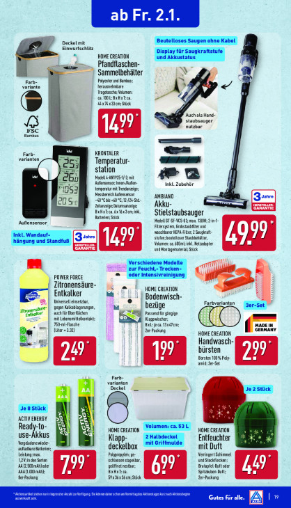 Bitte beachten Sie, dass dieser Text automatisch generiert wird und möglicherweise Fehler enthältab Fr. 2.1. Deckel mit Einwurfschlitz « HOME CREATION Der Ee … Pfandflaschen- este =, Sammelbehälter Ne en Farb- Polyester und Bambus £ variante herausnehmbare à Tragetasche: Volumen: ca. 100 L:BxHxT:ca. à € 44x74x 33cm; Stück Auch als Hand- staubsauger FSC 1427 nutzbar Bambus 9 Farb- KRONTALER varianten Temperatur- 255 == station va Modell 4-AN1925-1/-2; mit a 2 ‚Außensensor; Innen-/Außen- Inkl. Zubehör temperatur mit Trendanzeige; 053 Messbereich Außensensor: AMBIANO HO 40 °C bis +60 °C; 12-/24-Std.- —_ ii Teitanzeige, Datumsanzeige, Akku- an HERSTELLER: BxHxT: ca. 6x 16x 3cm; inkl. 4 Batterien; Stück Stielstaubsauger Außensensor Modell GT-SF-VCS-03; max. 130W; 2-in-1- Filtersystem, Grobstaubfilter und waschbarer HEPA-Filter; 2 Saugkraft- stufen; beutelloser Staubbehälter, "I nn Ber 1243 Volumen: ca. 600ml; inkl. Netzadapter L EX NTIE und Montagematerial; Stück H POWER FORCE | Zitronensäure- a Entkalker HOME CREATION weren iM Bodenwisch- Universell einsetzbar, Farbv gegen Kalkablagerungen, hi bezüge ‚Zitronen‘ auch für Oberflächen Passend für gängige mit Lebensmittelkontakt; Klappwischer: 750-ml-Flasche Bxl je ca.13x47em: MADE IN m (Liter =3.32) er-Packung GERMANY HOME CREATION Handwasch- Ee iN bürsten Barsten 100% Poly- in amid; 3er-Set Farb- varianten LU Deckel anal Jess ACTIV ENERGY Ready-to- à | HOME CREATION Volumens en 5aL HOME CREATION use-Akkus Klapp- Entfeuchter Vorgeladenewieder- a 5 aufladbare Batterien deckelbox mit Duft Leistung: max. Polypropylen; ge- Verringert Schimmel 1,2V:in den Sorten schlossen stapelbar, und Stockflecken; AA (2.500 mAh) oder geöffnet nestbar; Bratapfel-Duft oder AAA(1.000 mAh); 799 BxHxT: ca. Spitzbuben-Duft; 19 Ber-Packung 59x 36x36 cm; Stück er-Packung " A