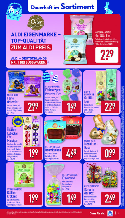 Bitte beachten Sie, dass dieser Text automatisch generiert wird und möglicherweise Fehler enthältDauerhaft im Sorti ment Le Oster En, ALDI EIGENMARKE - TOP-QUALITAT Mich-Crema wa rate Sion y ? ALDI DEUTSCHLANDS A L sag ms = a Peine Ohte hele, da > = OSTERPHANTASIE SP $, & Edelmarzipan OSTER: 4 MOSER ROTH Pasteten-Eier PHANTASIE = je | Versch. Sorten, z. Feine Nouget in Vollmilch MR Gefüllte & Ostereier schokolade oder Pflaume Eier Versch. Sorten, z.B. ’ in Zartbitterschokolade; Schokoladen: = Knusper-Nougatoder J enthäl z. T. Alkohol Mix oder Pfefferminz Prali 50-9-Packung 100-g-Packung 147 200-g-Beutel Le (kg= (kg= 1490) (kg=1145) ave ST #4 PHANTASIE à Lübecker Oa à 2 de, Edel. Marzipan MOSER ROTH Marzipan-Eer,umhült À Medaillon- es DS von Zartbitterschoko = | OSTERPHANTASIE lade; versch. Sorten; Hase 2.8. Classic oder Rum: ’ Baumkuchen Versch. Sorten, z.B. enthält. T. Alkohol | MitVollmilch oder À D A 7 Edelvollmilch oder 126-9-Packung | Zartbitter: weiße Schokolade: (kg =1592) Packung ( 97) 80-g-Stûck kg =19.80) RD OSTERPHANTASIE Se Eiskonfekt = € Mini-Tafeln mit Il Ostermotiven: 200-9-Beutel OSTERPHANTASIE Gi’ OSTERPHANTASIE (lg=745) Käfer in Blätter- n; der Box krokant A Edelvollmilch oder Gefüllte Vollmilch 71 m Caramel-Crisp L schokolade: 150-9: [ [ 100-g-Packung Packung (kg = 13.27) (kg=24.90) EL