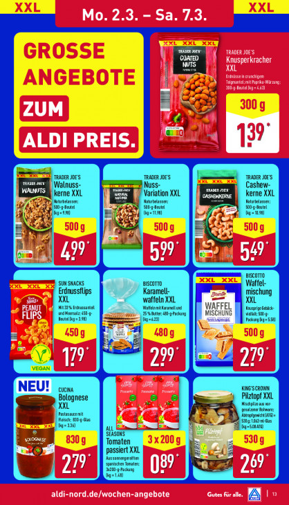 Bitte beachten Sie, dass dieser Text automatisch generiert wird und möglicherweise Fehler enthältMo. 2.3. - Sa. 7.3. 2072 LITE COATED 1 DE) Knusperkracher EN XXL BETT Fu Erdnüsse in crunchigem Teigmantel;mit Paprika-Würzung 300-g-Beutel (kg = 4.63) I ZUM X Le: 10 jo | ALDI PREIS. TRADER JOE'S TRADER JOE'S TRADER JOE'S Li 78073 Walnuss- ETS Nuss- ARADER JOES Cashew- ER kerne XXL TRS Variation XXL LIT kerne XXL Naturbelassen: DCI Naturbelassen; Naturbelassen; $ 500-9-Beutel 800-g-Beutel 800-g-Beutel tkg= 9.98) a3 (tg =1198) ® (EZ (kg = 10.8) it Pd 2 ha x. en GE au hg A, 49 BISCOTTO SUN SNACKS BISCOTTO Waffel- Karamell- El Erdnussflips do mischung XX waffeln XXL | L ED Mit 33% Erdnussanteil Waffeln mit Karamell und L Knusprige Gebäck- und Meersalz: 450-9- 25% Butter: 480-g-Packung vidfalt; 500-g- Beutel (kg = 3.98) (kg =623) | MISCHUNG Packung Kg = 5.58) | EE ik] KING'S CROWN CUCINA Passata, ee Bolognese Pilztopf XXL XXL Mischpize aus vor- gesalzener Rohwa Pastasauce mit 7 7 Abiropfgewicht(ATG) = Feist pie ® 530 g: 1.062-ml-Glas ® Eu ik (kg=5.08AT6) SEASONS ee Tomaten passiert XXL * Aus sonnengereiften spanischen Tomaten: { (y IL 20 Packung CI] — (kg= aldi-nord.de/wochen-angebote RS Gutes für alle. A