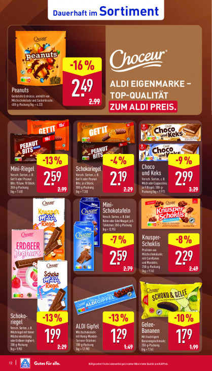 Bitte beachten Sie, dass dieser Text automatisch generiert wird und möglicherweise Fehler enthältnuts pea 1 6% EL and |L ALDI EIGENMARKE - Peanuts A Geröstete Erdnüsse, umhüllt von Milchschokolade und Zuckerkruste; TOP-QUALITÄT 400-9-Packung (kg = 6.23) 2.99 ZUM ALDI PREIS. Ds 14 EN di Sally oco (€ und! Keks. LL af ie U PE LA Vn 11) Li) x Pp LE NU T A Pr; cho N Î Fund Vars. an? I% Mini-Riegel Schokoriegel Li ea Versch. Sorten, z.B. Versch. Sorten, z.B. und Keks LEO GT 59 LES GE Versch. Sorten, z.B, its; 15 bzw. 18 Stück; Bits; je 6Stück; Milch oderCappuccino; 350-9-Packung ENNE CRETE (kg=7.40) kg=7.30) 5 EE CRK] Dd Coeur Mini- ik Or Schokotafeln Kn USpe: 1% 8 Versch. Sorten, z.B. Edel ho, TETE Ringel É EN Täfelchen; 0-g-Packung LE a tkg= 12.95) Groes 7 Knusper- 1 Schoklis % FRDBEER Pralinen aus Milchs chokola de: mit Cornflakes > und Mandeln; 2h NN va a 2 (kg =916) Ze Schoko 6, Œ Riegel Ce Alf ar orte S ® a N TC 13% 1 0% LE Gelee- Versch. Sorten, z.B. ALDI Gipfel y ISEEN Milchschokolade Bananen Milcheremefüllung mit Honig-Mandel- Mit ruchtigem ik] oder Erdbeer-Joghurt; Torrone-Stücken; RETE DT 19 100-g-Packung 2 Fan re tkg=12.90) (kg =726) Gutes für alle. POREN Lebensmittel anzin deiner Nein hoher Qualität ımALDI Pre AN