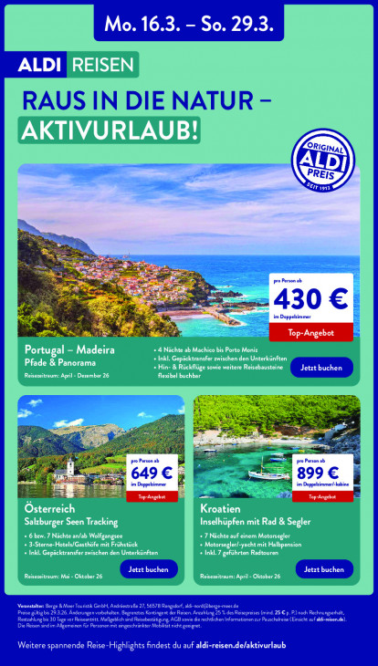 Bitte beachten Sie, dass dieser Text automatisch generiert wird und möglicherweise Fehler enthältMo. 16.3. - So. 29.3. ALDI RAUS IN DIE NATUR - ar à + Ee pro Person ab = Fa 22 430 € u im Doppeltimmer Ga en ENE ji z Br P D = = pro Person ab 649 € Be 899 € im Doppelzimmer at, = Doppeltimmer/-kabi ES ES. ei A Top-Angebot LATE eer Tour nel DE EEC wer? 2 Res Mi Lem er Iten. Begrer AN ingent AG EN n. Anzahlu Informationen eiseprei (mind. 25 Ep. P) uschalreise (Eins DUT ERA n.de), halt, Ns indim Al ER En AT nicht gecignt. Weitere spannende Reise-Highlights findest du auf aldi-reisen.de/aktivurlaub