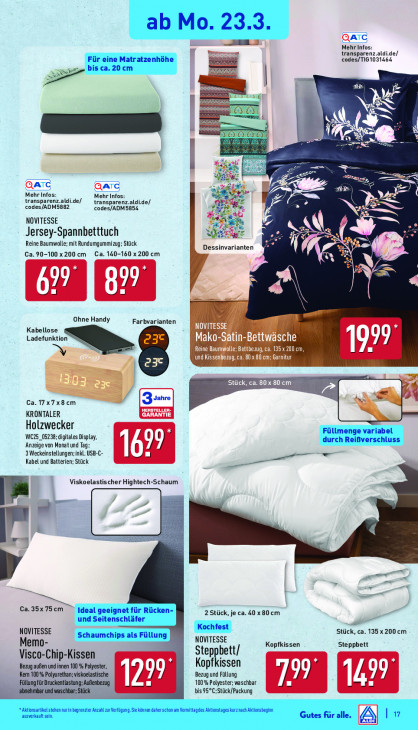 Bitte beachten Sie, dass dieser Text automatisch generiert wird und möglicherweise Fehler enthält© 2 Mehr Infos: transparenz.aldi.de/ codes/TIG1031464 EN = L51f| neee x En AN! u enr. > E © cu p- Fr ee u > ae & & Eee Mehr Infos: Mehr Infos: transparenz.aldi.de/ transparenz.aldi.de/ = codes/ADM5882 codes/ADM 585, B N NOVITESSE Jersey-Spannbetttuch Reine Baumwolle; mit Rundumgummizug: Stück Dessinvarianten Ca. 90-100x200cm Ca. 140-160x200 cm x EN N » Pr \ 69° 189° N ! Ohne Handy Farbvarianten LENZ Kabellose Ladefunkti Mako-Satin-Bettwäsche 99 Reine Baumwolle; Bettbezug, ca. 195 x 200 cm und Kissenbezug, ca. 80x B0 cm; Garnitur +8 Stück, ca. 80 x 80 c Ca.17x7x8cm KRONTALER Holzwecker WCZS_05238: digitales Display, Anzeige von Monat und Tag: 3Weckeinstellungen; inkl. USB-C- Kabel und Batterien; Stück Zn ue + Viskoelastischer Hightech-Schaum \ el - pn Ca. 35x75cm 2 Stück, je ca. 40 x80 cm NOVITESSE Sien 135 x 200 cm Memo- NOVITESSE Kopfkissen Steppbett Visco-Chip-Kissen Steppbett/ Bezug außen und innen 100 % Polyester, Kopfkissen Kern 100 % Polyurethan; viskoelastische Bezug und Füllung yLLE 124 Füllung ürDruckentlastung; Außenbezug 100% Polyester: waschbar ‚abnehmbar und waschbar; Stück bis 95°C;Stück/Packung