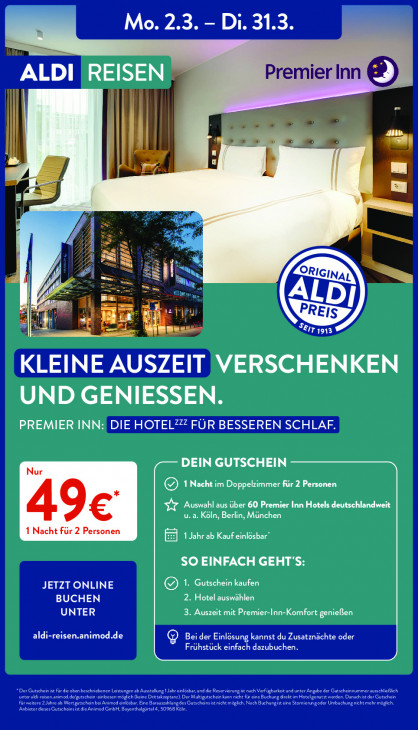 Bitte beachten Sie, dass dieser Text automatisch generiert wird und möglicherweise Fehler enthältMo. 2.3. - Di. 31.3. ALDI Premier Inn ® REISEN | 2ER : 4 A [I sl CNE SEIT 1913 KLEINE AUSZEIT VERSCHENKEN UND GENIESSEN. PREMIER INN: DIE HOTEL? FÜR BESSEREN SCHLAF. DEIN GUTSCHEIN ©) 1Nacht im Doppelzimmer für 2 Personen D CET CAE CE ET EU ET REN CO: mh REE SO EINFACH GEHT'S: JETZT ONLINE &) 1. Gutschein kaufen BUCHEN 2. Hotel auswählen UNTER 3. Auszeit mit Premier-Inn-Komfort genießen aldi-reisen.animod.de Frühstück einfach dazubuchen. Bei der Einlösung kannst du Zusatznächte oder