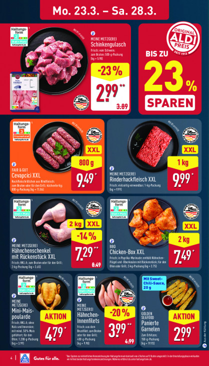 Bitte beachten Sie, dass dieser Text automatisch generiert wird und möglicherweise Fehler enthältMo. 23.3. - Sa. 28.3. Haltungs- ze form KA 6 u Zen N MEINE METZGEREI No) ‘matungsormde Schinkengulasch Frisch; vom Schwein; zum Braten: 500-g-Packung BIS ZU Kr TA) 2 2 3% "7 caso VE % 99" er SS Ta Haltungs- ig, 9 7 form Du ZS % 7 % er > NE] dl atungtern.se Ss Ho RS —& De et SUR » CA Cn Sa er Ge 800g FAIR &GUT MEINE METZGEREI Cevapcici XXL Rinderhackfleisch XXL Hackfleischröllchen aus Rindfleisch; IC} 99 zum Braten oder für den Grill; küchenfertig; Frisch: vielseitig verwendbar: 1-Kg-Packung 800-9-Packung (kg =11.86) (ka =999) Haltungs- 7 Haltungs- form a =: form I Zen = un Zen ESE Nr Pr x, =) Sa natungtorm.e hatungtormae ae or 2 kg [XXL | Pe x -1 4% Ee ed MEINE METZGEREI BBQ Hähnchenschenkel Chicken-Box XXL mit Rückenstück XXL Frisch; in Paprika-Marinade; enthält Hähnchen- Ai Frisch; HKL À; aum Braten oder Für den Grill; TE [TERN ETUI CT TE EU DÉTECTE NT En) Z-kg-Packung (kg =3.65) Haltungs Mi, Vo form Haltungs- form %, mn Sen % D 1 un Zen atungstormde hatunostermée 5 > alla | = Zl METZGEREI Vi HN Mini-Mais- GOLDEN Hähnchen- 2 0% SEAFOOD poularde Innenfilets Frisch; HKLA; ohne x Panierte Hals und Innereien; Frisch;aus dem la ED E12 Brustfilet; zum Braten Hi Garnelen gefüttert; fürden oder für den Grill; ET TR IEDEREEN 419 400--Packung 150-9-Packung 29 kg= 39) (TEL) ERA) Creer "Das System zur einheitlichen Kennzeichnung.der NEN VREE A EL 4 | Gutes für alle. wir Artikel beider Haltungsfornkennzeichnungen. Näheres erfährst du unterhaltungsfom.de. A