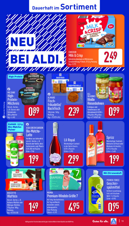 Bitte beachten Sie, dass dieser Text automatisch generiert wird und möglicherweise Fehler enthältDauerhaft im Sortiment 1 I I vd LES ME GI, 7 7 7 7 7 7 7 7, 2 sp 7 7 7 Vous OUDE 7 7 AL ‚Aue era 7 7 Î 7 7 7 NEUZ 7 4 WII MT 0 CHOCEUR a Milk & Crisp Vollmilchschokolade mit Milchereme- BEIALDI. ECM MIE 25 Cv) LA 2 Pe #. #. CAMS A FT Fan EE ISCHFRIKADELLE A} Creer 5 Ben P MILSANI NE High- | SEASONS = ALMARE Protein- ESL Weiße Milchreis Riesenbohnen frikadelle/ Versch. Sorten, 1.8. Classic oder Backfisch CETTE In Aufguss oder Schokolade; DTA ee FIRE CS I Packung EL) ANT 0” CIE TE] (kg = 1707/1494) (kg =4.71 ATG/3.36) thält 2,59 6 tcha- CSA a1} 4 Pul Bio-Matcha- Latte Von Natur aus laktosefrei; Sprizz versch. Sorten, zB. Lil Royal Weinhaltiger Cocktail; DESSEN UT Weinhaltiger Cocktail Nektarine & Peach oder Rr Nad in der Sorte Cassis; LUE ETC LEZ HEURES | ME AAC 0,75-L-Flasche (CAN) (Liter = 3.99) (Liter = 2.65) a 19 Zi 19 ES es Mami, j Zus POWER FORCE ner Te Geschirr- DIPPED WA y © f "4 spülmittel giscorr 0 LUI Le Entfernt zuverlässig eN Fett:mit frischem Waffeln Premium-Windeln Größe 7 Duft; 1-L-Flasche Versch. Sorten, z. B. Ab 16kg; Auslaufschutz (Liter = 0.95) Vulkano-Waffeln oder für Tag und Nacht; Wikinger-Waffeln; GENE LESA atmungsaktiv; Packung [Ei Een 435 Ii (kg = 8.51/8.28) (Stück = 0.19) un. EUPEN OA el BOTEN DELETE Gutes für alle. | ıs
