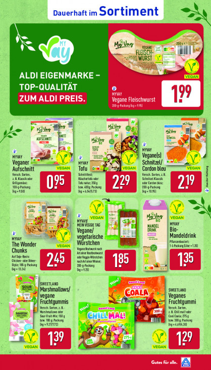 Bitte beachten Sie, dass dieser Text automatisch generiert wird und möglicherweise Fehler enthältDauerhaft im Sortim ent | MY 2000 Mg Vo VECANE (aan LEISCH lan all WURST ay ar ALDI EIGENMARKE - TOP-QUALITÄT 6 MYVAY ZUM ALDI PREIS. Vegane Fleischwurst 200-g-Packung (kg = 9.95) ee ® Ey Mi Vary F May Bi Ôs Mer veus arr ® Ti Scie AUFS( SCHNITT N une Bi 6e À ge ÿ TOFU A MYVAY MYVAY mie 8e à Veganels) Veganer —— + . ne 3 mar DITS en Schnitzel/ = Aufschnitt VEGAN Tofu Ora, Refl VEGAN Cordon bleu VEGAN Versch. Sorten, Schnittfest; Versch. Sorten, z.B. 2.B. Klassik oder Räuchertofu oder ‚Schnitzel Klassik Grllgemüse: Tofu natur; 3509 29 ‚oder Cordon bleu; 100-g-Packung bzw. 400g: Packung 200-9-Packung (kg=950) {kg = 6.54/5.73) (kg=1095) 9 AusderKühlung Maler N B en wr wete 0 Voy Bi VEGAN a MYVAY/ MEIN VEGGIE TAG MYVAY h DRINK MANDEL B À Vegane/ Bio- MYVAY vegetarische « Er a Mandeldrink “us 2 Würstchen Pflanzenbasiert; The Wonder VEGAN 1-1-Packung (Liter =1.35) Chunks Vegane Bratwurst nach ‚Art einer Rostbratwurst © Auf Soja-Basis: oder Veggie-Würstchen Chicken- oder Düner- 45 nach Art einer Wiener; Style: 185-g-Packung 200-G-Packung = (kg= 13.24) (kg=9.25) © CEB a ri) SWEETLAND SWEETLAND Marshmallows/ LA vegane | Veganes Fruchtgummis - Fruchtgummi ee Versch. Sorten, z.B. Versch. Sorten, À MARSH Marshmallows oder etn ij 2.8. Chillmal! oder Sour-Frit-Mi: 160 g HALL MA Cool Coala: 2759 bzw. 180 : Packung em] Al ban. 300g: Packung (kg =927/7.72) (ko=4.494.30) Vi N # SI > BEE le ONE “une VEGAN ee. el VEGAN