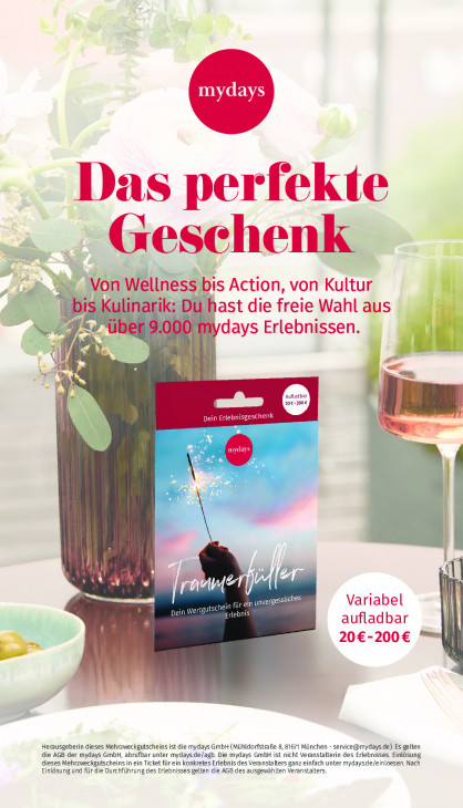 Bitte beachten Sie, dass dieser Text automatisch generiert wird und möglicherweise Fehler enthältDas perfekte Geschenk Von Wellness bis Action, von Kultur 3 bi ‚Kulinarik: Dürhast die freie Wahl aus DO = days Erlebnissen. I | 4 4 Ir 20€-200€ Aufladbar Dein Erlel jenk Du A © | AT I Variabel Dein W vertgutschein für ein unvergessliches AUD aufladbar | 20€-200€ = {| id Herausgeberin dieses Mehrzweckgutscheins ist die mydays GmbH (Mühldorfstraße 8, 81671 München - [email protected]). Es gelten dieses Mehrzweckgutscheins in ein Ticket für ein konkretes Erlebnis des Veranstalters ganz einfach unter mydaysde/einloesen. Nach die AGB der mydays GmbH, abrufbar unter mydays.de/agb. Die mydays GmbH ist nicht Veranstalterin des Erlebnisses. Einlösung Einlösung und für die Durchführung des Erlebnisses gelten die AGB des ausgewählten Veranstalters