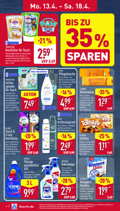 Bitte beachten Sie, dass dieser Text automatisch generiert wird und möglicherweise Fehler enthältLU 13.4. - Sa. 18.4. M5 4 LJ SAGROTAN Nachfüller No-Touch Flüssige Hygieneseife für automatischen 59 Seifenspender versch. Sorten, zB. Kamillen-Duftoder Kids Hygiene-Seife SPAREN Paw Patrol, Apfel-Duft; 250-ml-Flasche UVP 3.29 (Liter =10.36) DOVE Ï ACHERN N Versch. Sorten, z.B. SAGROTAN Ne Men+Care Clean Comfort Seifen- are ader Cremig-sanft:700m bzw. 720 ml; Flasche (A spender ARE {Liter =719/693) ACTU Automatischer utterkekse Seifenspender mit ETAGE inkl. Nachfüller PC LOC CCR CL USP Sardinia-Dreams, (XX 99 29 250 ml, und Batteri TT) UVP 5:99 = N DOVE | iki fe Antitranspirant (ul Versch. Sorten, z.B. Original 10 33 GLADE = KLA TS | | Dove 200-ml-Dose [Liter =12.45) Touch & | Fresh Nachfüller KEE Da COUT Zen oder Sensual Sandalwood & Jas- 19 2e PLANNER (LE 12277 (Liter = 199.00) CORAL " ANTIKAL Mez Flüssig- waschmittel Kalkreiniger Ln REEN 2.B. Classic oder ‘Color: für 60 An- Fresh; 800-ml- wendungen:3-L-Flasche «a 6 Flasche (Liter = 3.49) = (Anwendung =0.17) ad 79 Lin ilch= und Lie CET LE UVP 3:89 Schoklade:180-g- TA Packung kg = 11.06 "Pam Patrol: 2026 Spin Master. PA PATROL and al relaedles,logs,caracers;and SPINMASTER ogoare trademarks a pn Master 1. PT ETAT EE TE NL EN A ET TELLEN ONEENS