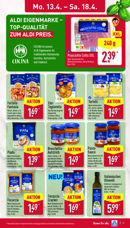 Bitte beachten Sie, dass dieser Text automatisch generiert wird und möglicherweise Fehler enthältALDI EIGENMARKE - (A ® TOP-QUALITÄT peen ZUM ALDI PREIS. CUCINA ist unsere I] ALDI Eigenmarke für D traditionelle italienische Gerichte, Aufschnitte mu (Ua und Feinkost. 8 Li ® sen an ATEL Le P ORTELL, El el u 709 = m Lan bj = ak PER | I I 5 zE dl ES | 6 Tortelli Farfalle Eier- Nach italienischer Fantasia Versch. Sorten, z.B. Tagliatelle Art; versch. Sorten, 1. B. Ricotta-Tomate Zeolori oder 6 calori; hergestellt Aus Hartweizengrieß: a oder Käse-Rucola; hergesteltin alien: Lik 3 in alien: 500-g- TT 300-g-Packung [ . à ) 250-g-Beutel(kg=676) Packung (kg =298) (ko=4) Li EU ® ar} a | EE N es A | rat Bruschetta- Pasta Piada Aufstrich Sauce Nach italienischer Versch. Sorten, z.B. Nachitalienischer Art; Art; Weizentortillas 190: getrocknete Tomate versch. Sorten, 2. B. mit Olivenäl; oder genre Paprika: Tomate-Ricotta oder U D: «Stück; 360-9- N ir hergestelltin li [ Toscana; 400-ml-Glas [ Packüngikg = 286) 0geflas{l (liter =4.23) © ® Bean u Italienisches Be edle RE) Olivenöl le — Unfitriert;kaltgepresst: 500-ml-Flasche hergestellt in talen: JL 8 (Liter =11.98) Î Focaccia- ve Focaccia Cracker Nach italienischer Nach itlienischerArt; Art; Sour Cream oder A versch. Sorten, z. B. Käse & Zwiebeln; + I k Classic oder Pomodoro; u ) 7 | 250-9-Packung [ 100-g-Packung [ wu (kg=5.96) (kg=16.90)