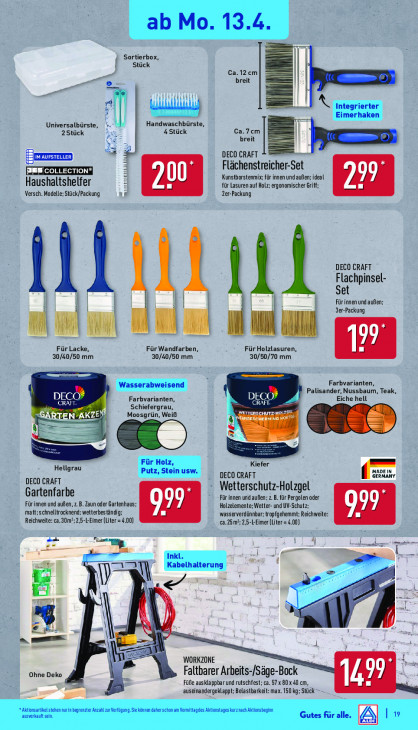 Bitte beachten Sie, dass dieser Text automatisch generiert wird und möglicherweise Fehler enthältSortierbox, | Stück Ca. 12cm u breit a = Wu Universalbürste, F Handwaschbürste, ES 2Stück 4Stück Ca.7cm breit 1 = DECO CRAFT Flächenstreicher- set Haushaltshelfer Kunstborstenmix; für innen und außen; ideal für Lasuren auf Holz; ergonomischer Griff; Versch. Modelle; Stück/Packung î 2er-Packung DECO CRAFT Flachpinsel 11 11 Set | H Für innen und außen; 3er-Packung m Für Lacke, Für Wandfarben, Für Holzlasuren, 30/40/50 mm 30/40/50 mm 30/50/70 mm Farbvarianten, DECO: DECO | Palisander, Nussbaum, Teak, CRAFI Farbvarianten, CRAFT, Eiche hell Schiefergrau, Werrenschurz- ee N’AKZ Moosg (SRE ee Kiefer Hellgrau ee Iv Fa nues DECO CRAFT DECO CRAFT Gartenfarbe Wetterschutz-Holzgel Für innen und außen, z. B. Zaun oder Gartenhaus: Für innen und außen; z.B. für Pergolen oder matt;schnelltrocknend; wetterbeständig: Holzelemente; Wetter- und UV-Schutz; Reichweite: ca.30m?; -L-Eimer (Liter = = 4.00) wasserverdünnbar; tropfgehemmt; Reichweite: ca. a LEimer (Liter = 4.00) - r 5 Ds 5 < met al m u N \ en WORKZONE Ohne Deko Faltbarer Arbeits-/Säge-Bock Füfe ausktappbar und rutschfest; ca. 57x80x40 cm, 1499 auseinandergeklappt; Belastbarkeit: max. 150 kg; Stick —