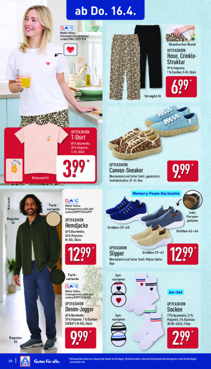Bitte beachten Sie, dass dieser Text automatisch generiert wird und möglicherweise Fehler enthältIN ab Do. 16.4. Sn ATC pt m Mehr Infos: transparenz.aldide/. rues X N codes/MIL1039328 & Er Elastischer Bund us UP2FASHION le) Na Hose, Crinkle- Struktur 99 % Polyester, a 1% Elasthan; S-XL; Stück ’00° 0) Straight fit a rez! 2 ze eed Kai ı “ A a ES a A À ) LS # > = zn % ESA SET > 5 et ze B ee Sa KS \ a UP2FASHION 7 Canvas-Sneaker J Obermaterialund Futter Textil; gepolsterte 977 a TE |, Textildecksohle; 37-41; Paar | Memory-Foam-Decksonle ATC, Farb- MitK estellt variante transparenz.aldi.de/ Mehr Infos: codes/GPF1034299 Inkl. Fersen- Regular UP2FASHION polster fit Hemdjacke Größen 37-45 60% Baumwolle, >> Größen 42-44 40% Polyester; M-XXL; Stück UP2FASHION 0 + Größen 37-41 y Slipper L 7 Pr Paar Obermaterial und Futter Textil; Phylon-Sohle; [ Lu D í Farb- Set- variante variante = 8 Mehr Infos: + transparenz.aldi.de/ 2er-set codes/GPF1026126 UP2FASHION UP2FASHION Denim-Jogger — Socken 60% Baumwolle, Set- 77% Baumwolle, 21% 39% Polyester, 1% Elasthan variante Polyamid, 2% Elasthan: (LYCRA®); M-XXL; Stück 35/38-43/46; 2 Paar Regular fit ed kik en da an Vom 20 Gutes fü en urbain