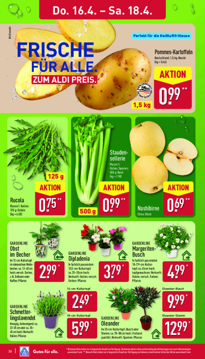 Bitte beachten Sie, dass dieser Text automatisch generiert wird und möglicherweise Fehler enthältDo. 16.4. - Sa. 18.4. MitKlerstltt Perfekt für die Heißluftfritteuse +. . Pommes-Kartoffeln FRISC ME \ Deutschland: 1,5-kg-Beutel (kg= 0.66) FÜR ALL 3 ; Er AKTION Se ke ZUM ALDI PREIS. Ke er St ruse” 1,5 kg 2 = a A oz = > y, N | A 4! aD 5 N pP x | « x zi > Es. p) 125 g AKTION AKTION AKTION —r Rucola Klasse1; Italien; ] 126-9-Schale | CI tkg = 6.00) = fi 7 pe GARDENLINE A Er. GARDENLINE Es “ el Obst Margeriten-” im Becher \ GARDENLINE Busch (> ei Im12-cm-Kulturtopf im dekorativen Motiv Dipladenia 18-/19-cm-Kultur- Infarblich passendem becher; ca.12-40cm In farblich passendem hoch; versch.Sorten, ca.25-30cm hoch; 105-cm-Kulturtopf: topf.ca.45em hoch: LB. Erdbeere oder Herkunft: Italien; versch. 79 topfgewachsen: Herku Italien; versch. Farben; Kaffee; Pflanze Farben; Pflanze Pflanze Xi Oleander-Busch 14-cm-Kulturtopf Es Î at va ) IC) Le GARDENLINE Schmetter- 18-cm-Kulturtopf Oleander-Stamm lingslavendel GARDENLINE Knospig,farbezeigend: ca. Oleander 22-15 cm oder ca. 35- 45 cm hoch; Herkunft: Im 20-cm-Kulturtopf; Busch oder Stamm; ca. 70-80 cm hoch; Freiland- Italien; Pflanze 2 ‚ER qualität: Herkunft: Spanien; Pflanze artikelstehen nurinbe Ar n dahers Lt) En 1 Gutes für alle. ET en nurin begrenzier A ET Pare on n der CE