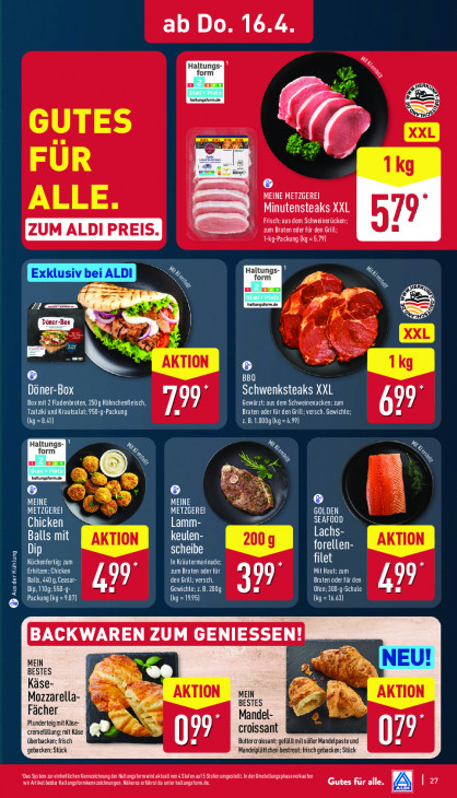 Bitte beachten Sie, dass dieser Text automatisch generiert wird und möglicherweise Fehler enthältab Do . 16.4. Mg, Haltungs- form % ve % In Zen MER Ka Ke malungstormde 2 5 a GUTES = EN = Le „Ep cd FÜR 1kg MEINE METZGEREI ALLE. Minutensteaks XXL Frisch; aus dem Schweinerücken; M ALDI PREIS. zum Braten oder für den Grill; 9 ET CUT EN) Haltungs- 2 9, C7 form NZ I Zen A % Re cé / 7 74 Es natungstorn.ce » pe oor AGN 8 = 9 FN Cr: >2 Dôner-Bos ÇA 2 re — == = AKTION © ze CE Döner-Box Schwenksteaks XXL Box mit 2 Fladenbroten, 250g Hähnchenfleisch, ‚Gewärzt; aus dem Schweinenacken; zum LA Taatziki und Krautsalat; 950-g-Packung yLLE Braten oder für den Grill; versch. Gewichte; 6 (ka =8.41) 2. B.1.000g kg = 6.99) Haltungs- form 2 %, > % % 4 un Zen 4 matungstormde Ad HE end HE a | Chicken Lamm- SEAFOOD Lachs- Balls mit LEICHE scheibe forellen- IN} filet Küchenfertig; zum In Kräutermarinade; HAE aum Braten oder für Mit Haut; zum Balls, 440g, Ceasar- 99° ‚den Grill; versch. 99° Braten oder für den Dip, 11 550-9- PER Ofen; 300-g-Schale x] Cn Packung kg = 07) (ig =1995) (kg = 16.63) EZ, ZUM GENIESSEN! EI Bestes rs Käse- AKTION MEIN _AKTION Mozzarella- w ESTES Fächer Mandel- PlunderteigmitKäse- croissant überbacken; frisch cremefülung: mit Käse 99 ik] Buttercraissant; gefülltmitsüßer Mandelpaste und gebacken: Stück Manet bestreut:frisch gebacken; Stück "Das System zureinhitüchen Kennzeichnung der Haltungsform wid aktuellvond Stufen auf5 Stufen umgestllt.In der Unstelungsphaseverkaufen DT TO MAT ELU Gutes für alle, A 2