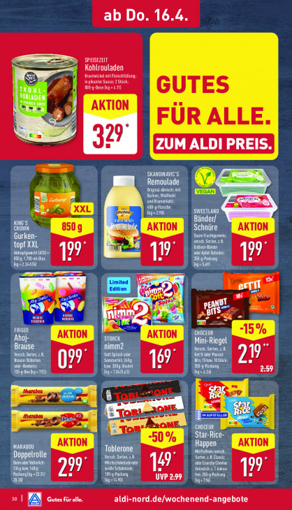 Bitte beachten Sie, dass dieser Text automatisch generiert wird und möglicherweise Fehler enthältab Do. 16.4 SPEISEZEIT Kohlrouladen Krautwickel mit Fleischfüllung ©: 800-g-Dose (kg =4.11) in pikanter Sauce; 2 Stück; GUTES AKTION N FUR ALLE 2 7 329 4 ae SKANDINAVIC’S Remoulade Gurken, WeiBkohl Original dänisch: mit = und Blumenkohl; 5 sec Bm E La SERLINA rer] SWEETLAND Bänder/ LUTTE) CROWN AKTION KALTE) AKTION Gurken- versch. Sorten, z B. Saure Fruchtgummis: topf XXL Erdbeer-Bänder MOT Ce 99° 19 ‚oder Apfel-Schnüre; 8509; 1.700-ml-Glas mi EN 199 (kg =236AT6) IE] ee med 15% È ag u ) wi 3x “= See N EA MU si) PET HU En ges A Cu je = ala) AKTION RNA Ahoj. STORCK Brause nimm2 Versch. Sorten, z. B. Mini-Riegel Versch. Sorten, z.B. Saft Splash oder Get'it oder Peanut Brause-Stäbchen 99 ERI EREA 19 KE CRETE) 169 360-g-Packung TE} (Kg=7.04/5.63) [kg=6.26) u Ta ML ni cn man gn ed FLE ‚CHOCEUR Star-Rice- 50% MARABOU KEO Happen Doppelrolle KEEN A: Mit Puffreis; versch. Sorten, z B.Classic Dual Baim oder Vollmilch; Milchschokolade oder EL EAA weiße Schokolade: 14 Vollmilch: 2. T.kakao- hai za 299: OT frei 250-g-Packung 199 (kg=1490) LEZ: CET) aldi-nord.de/wochenend-angebote a0 | A] Gutes für alle.