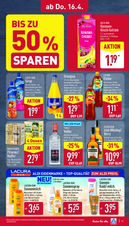 Bitte beachten Sie, dass dieser Text automatisch generiert wird und möglicherweise Fehler enthältab Do. 16.4. "B LOL BIS ZU Ci ee Bananen- Kirsch-Getränk BANANA- LT. aus Fruchtsaft- CHERRY EEC RET {Liter= 119) Drink | AKTION Vo ur: 17 1f x ET Orangina ‚sun Sirup mit echtem Fruchtfleisch; 12% Fruchtsaftgehat; Kalorienarm; versch. Versch. Sorten, z. B. versch. Sorten; z B. Sorten,z.B.Pfsich oder M Multivitamin oder Fairy CLEAN AOL Berry Zero: 2.T.chne EEE EA ge EN Be Zucker: LFlasche TN) che (Liter 0.89 (TT CA SL) ri Hi Cl 5 mn jr | LR FI = 1 ES GEN Jen 1? lied OL 4 + | 9MILE CRU ke arve, RADLI Fadi MATIE Vod Irish Whiskey/ st =] Berr 37,5% Vol: 0,7 40% Vol. bzw. 32,5 % Vol; 4 Dosen RUE LATE 0) GAN: GET ne Lk HE DÉC LEE 9MILE TI 99 Zagl. Pfand 4x 0.25 = al ARZTES NT YA {liter =1.40) LES Ed UVP 45:99 LACURA ALDI EIGENMARKE - TOP-QUALITÄT ZUM ALDI PREIS. sun Gilt für alle LACURA SUN NEU! 3 Artikel im Sortil nt LACURA SUN Sonnen- LACURA SUN fluid/-milch Sonnenmilch Wasserfest; LSF 50; Schutz& Sonnenspray Wasserfest; versch. Sorten, z. B. Wasserfest; LSF 30 oder Pflege oder Sensitive: Anti-Age-Sonnenfluid, LSF 50, LSF 50; 250ml = 3.65 bzw. 200ml = 5.25 bzw. oder Sonnenmilch Kids, LSF 50+; 4.5 0-ml-Flasche 5 200. L-Flasche 50 ml = 3.95 bzw. 200 ml (Liter = 14.60/18.20) (Liter =26.25/28.75) Tubelasche (Liter =79 0/26.) m ce ES ausverkauftsei OEL stehen urin begrenzter Anzahlzur Verfügung. ie können daher schon am Vormittag des Aktionstageskurznach Ationsbegin Gutes für alle. 31