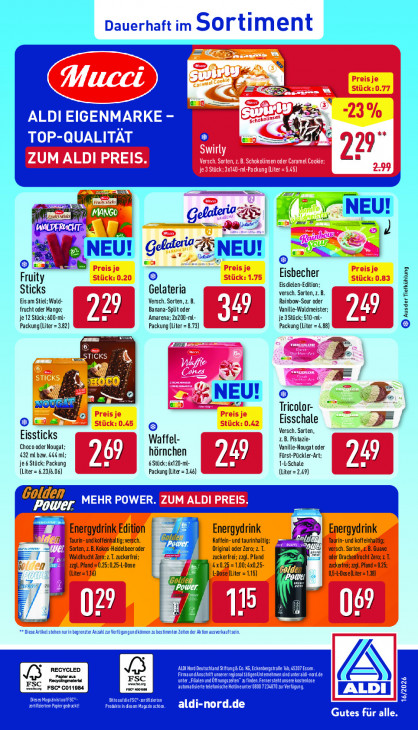 Bitte beachten Sie, dass dieser Text automatisch generiert wird und möglicherweise Fehler enthältDauerhaft im Sortiment I SE Fr ALDI EIGENMARKE - Ara TOP-QUALITAT E a 729 IR = er fl Geladeriee Si a De Zelte da 2 EE: Geller? Gete) © le Re Eisbecher Fruity Eisdielen-Edition; Sticks Gelateria versch. Sorten, z. B. Eis am Stiel; Wald- Versch. Sorten, z. B. DL Rainbow-Sour oder À frucht oder Mango; 2 1 Banana-Split oder ns ) Vanille-Waldmeister; je 12 Stück; 600-ml- y mel Amarena; 2x200-ml- je 3Stück; 510-ml- L a Packunglliter = 3.82) Packung (Liter =8.73) Packung (Liter = 4.88) & Ausder Tiefkühlung @ en TICKS &. > ‚NEU! Tricolor- 7 = = Eisschale © k Eissticks Versch. Sorten, LB. Pistazie- Waffel- Choco oder Nougat: hörnchen Vanille-Nougat oder 432 ml bzw. 444 ml; ] J Fürst-Pückler-Art; ) je6 Stück; Packung L LR ‚6 Stück ; 6x1 20-ml- L = 1-L-Schale L . (Liter = 6.23/6.06) Packung (Liter = 3.46) (Liter = 2.49) Golden Power. MEHR POWER. ZUM ALDI PREIS. Energydrink Edition FRE Energydrink 7 Em Energydrink = nur _ LL 74 Teurin- und koffeinhaltig: versch. Koffein-und taurinhaltig: Taurin-und koffeinhaltg; 7A Sorten, z.B.Kokos-Heidelbeer oder =. Original oder Zero; 2. T. \ versch. Sorten „zB. Guave. Waldfrucht Zer zuckerfrei: zuckerfrei; zagl. Pfand oder Drachenfrucht Zero; 2 . Û zl. Pfand = 5-L-Dose 4 4x0. 10 ‚x0,25 kerr; zl. Pfand= 5 (Uter=116) LDdse (Liter = 1.15) je 6 05-L-Doseliter = 1.38] Rey RUE! 7 Eg 1 | J 07 | Bl U J a Diese Artikel stehen nurin begrenzter Anzahl zur Verfügungundkönnen zu bestimmten Zeiten der Aktion ausverkauften NA) ALDI Nord Pu PAN enbe HAN al FSC Frmaund) EE rregionaltätigen Unter CET DOTE RT ere FSC* CO11984 pac vooren wrr automatisere telefon EMULE u Verfigung CE TE Er LER 16/2026 ETS Dr Dre re aldi-nord.de Gutes für alle.