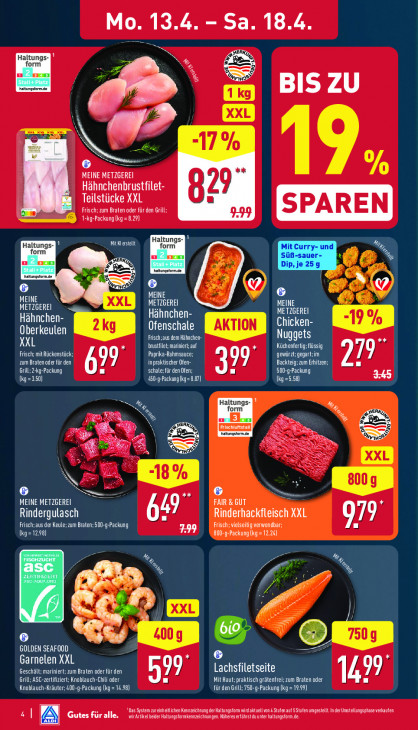 Bitte beachten Sie, dass dieser Text automatisch generiert wird und möglicherweise Fehler enthältMo. 13.4. - Sa. 18.4. Se 2 Haltungs form = CS = à u Zen Kr a natungtorm.e BIS ZU EEN 2 a; 1 1% 19 V MEINE METZGEREI Hähnchenbrustfilet- 29" Teilstücke XXL Frisch; zum Braten oder für den Grill; RENT EL) EIEREN Haltungs- Haltungs- form C2 a Sen a Ser de, atungstormae natungstorn.se É = 3 Ko: CA \ MEINE 6 I XXL METZGEREI [EINE A5) METZGEREI 2 METZGEREI Hähnchen- Hähnchen- Ofenschale Chicken- Oberkeulen XXL Frisch;aus dem Hähnchen- a Nuggets ** brustfilet mariniert auf Küchenfertig:flüssig Frisch; mitRückenstück; [ee een gewürzt; gegar 1 aum Braten oder für den inpraktischer Ofen- PET RE 6 ECC 1] ÉTAT (lg =350) Pa] TEL) Haltungs- %, form MERS, Se % 2 Oe a eg + MERS =: natungstrn.ce Or N 8 == ei on N % 800g 6 MEINE METZGEREI FAIR & GUT g“ Rinderhackfleisch XXL Rindergulasch 19 Frisch;aus der Keule; zum Braten: 500-9-Packung Frisch; vielseitig verwendbar: (TE DE er) %, % % 2 1/2 = a — Y 6 A na) Garnelen XXL Geschält; mariniert; zum Braten oder für den 99° re Grill; ASC-zertifiziert; Knoblauch-Chili oder CI Mit Haut; praktisch grätenfrei:zum Braten oder 149 Knoblauch-Kräuter: 400-g-Packung (kg = 14.98) für en Grill; 750-g-Packung (kg =19.99) "Das Syst zur nich Kennzeichnung der Haltungsfom wird aktel von 4 tufenauf Stufen umgestellt. Inder Unstelungsphaseverkaufen 4 | Gutes für alle. wirArtikel beider Haltungsformkennzeichnungen. Näheres erfährst du unter haltungsform.de. A