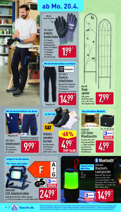 Bitte beachten Sie, dass dieser Text automatisch generiert wird und möglicherweise Fehler enthält. so = ab Mo. 20.4. Nitril- beschichtet ; 7 S Bi / Teese TOP CRAFT Ie ik je Arbeits- À Lan handschuhe u 95 % Polamid, 5 % Elasthan mit Nitrilbeschichtung, Schaft: 70 % Polyamid, 19% Polyester, \/ 7% Elastodiene, 4% Elasthan; fl SU7I-XKL (1); Paar N Ban Mit Stretcheinsätzen am Bund . & TOP CRAFT Stretch- = Arbeitshose Oberstoff 90% Polyamid; 10% Elasthan, Einsätze BELAVI 92% Polyamid, Rank- 8% Elasthan; 48-56;Stück md spalier Stal pulver beschichtet; wetter- est; ca. 30 x 173cm; 799 inkl Erdspiee Stck Regular fit 1 Ki Li [ Mit Stretcheinsätzen am Bund ss Verschiedene Modelle Je 3er-Set À „10 x 11 x8 cm 5 CAT CASALUX Ca.9x8x8cm LED-Solar- Regular fit QATG Arbeits- Se) Mehr Infos: transparenz. sneaker- Wandleuchte HERSTELLER. GARANTIE aldi.de/codes/KRG1950 Füraußen; IP44; Licht- TOP CRAFT Socken farbe: warmweißbzw. Arbeitsshorts 86% Baumwolle, Z.T.RGB; Leuchtdauer: bis au 8 Std.;inkl. 65% Polyester, 13% Polyester, 35% Baumwolle: 1% Elasthan; Montagematerial; 49 48-56;Stück 35/38-43/46; 3 Paar Stück/Packung Integrierte Steckdose a Für innen und außen AMBIANO Integ/ le krofon Bluetooth- Ca. { 19 cm EMS organ) De für innen undaußen [ni EE Ma Serre OT B LT HERSTELLER. Betriebsdauer. EEN D GARANTIE USB LE Stück WORKZONE LED-Arbei trahler g° Modell NP-AS-2 5 6.500 Um; dimmbar A ca 27x28x19 bel: ca. 3 m; inkl. H; Kdf = _— * Akionsartkel stehen urinbegrenter Anzahl zur Verfügung. Stekönnendaherschon am Vomittagdes Aktionstages kurz ach Aktionsbeginn auser- kauften. !Die Bluetoth"-Wortmarke und Logos sind eingetragene Marken Im Besitzder Bluetooth SG, Inc. undjede Verwendung dieser Marken "| (A) Gutes füralle. durch Jie Du Electronics Technology Co, Ltderfolgtunter Lizenz Andere Warenzeichen und Handelsnamen gehören ihren eweligen Eigentümern