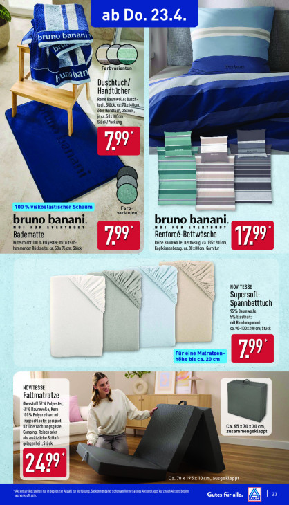 Bitte beachten Sie, dass dieser Text automatisch generiert wird und möglicherweise Fehler enthältab Do. 23.4 C0 bruno banai A CL Farbvarianten pan Duschtuch/ Handtücher Reine Baumwolle; Dusch: tuch, Stück, ca:70x140cm, óderHandtuch, 2Stück, je ca.5Ox10OC mmm, Stück/Packung Ee 799 = kt TS an ar sn j Farb- varianten bruno banan bruno banani NOT FOR EVERYBOD i NOT FOR EVERYBODY Badematte Renforcé-Bettwäsche Nutzschicht 100 % Polyester: mitrutsch- 799 Reine Baumwolle; Bettbezug, ca. 135x 200cm, I hemmender Rückseite; ca. 50x 76. cm; Stück Kopfkissenbezug, ca.80x80cm; Garnitur 7 lg a NOVITESSE / IJ Supersoft- Spannbetttuch 95% Baumwolle, 5% Elasthan; mit Rundumgummi ca.90-100x200 cm; Stück 799 Le dé NOVITESSE Faltmatratze Oberstoff 52% Polyester, Mr 48% Baumwolle, Kern 100% Polyurethan; mit Trageschlaufe: geeignet = für Übernachtungsgäste, Ca. 65x70x30 cm, Camping, Reisen oder mm zusammengeklappt als zusätzliche Schlaf- gelegenheit:Stück = 2 Tu Li Ca. 70 x 195 x 10cm, au: Aktionsartikel stehen nurin begrenzter Anzahl zur Verfügung. Sie können daherschon am Vomittagdes Aktionstages kurz nach Aktionsbegin ausverkauft se. Gutes für alle. Al