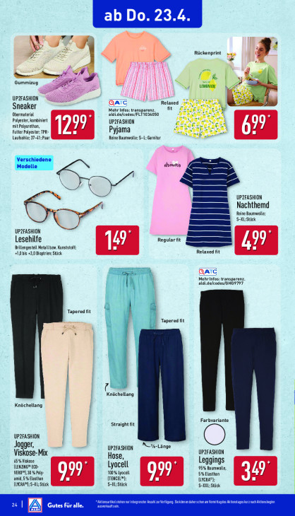Bitte beachten Sie, dass dieser Text automatisch generiert wird und möglicherweise Fehler enthältab Do. 23.4 C0 IT | a? à Rückenprint > de J nu: EZ MD Gummizug x I N ve 7. | | is | UP2FASHION | En QAT Relaxed > N Sneaker Mehr Infos: transparenz. fit EU Obermaterial aldi.de/codes/FLT1034050 10 se SR Polyester, kombiniert UP2FASHION fe LT mit Polyurethan, San a“ Futter Polyester; TPR- Pyjama 108 u Laufsohle: 37-41; Paar Reine Baumwolle; S-L; Garnitur 5 D Less + UP2FASHION Nachthemd Reine Baumwolle; S-XL;Stück UP2FASHION Lesehilfe Regular fit Brillengestell Metall bzw. Kunststoff; 149 el 49 +10bis +3.0 Dioptrien; Stück Relaxed fit ATC à Mehr Infos: transparenz. aldi.de/codes/6H69797 À I 5 Tapered fit Ei | Tapered fit FI Knöchellang Knöchellang Farbvariante Straight fit UP2FASHION Jogger, N7#-Länge OÖ UP2FASHION UP2FASHION Viskose-Mix Hose, 65% Viskose Leggings (LENZINGE ECO- Lyocell 95% Baumwolle, VERO"), 30 % Poly- 100% Lyocell 5% Elasthan amid, 5% Elasthan (TENCEL®); (LYCRA®); 37 (LYCRAP); S-XL; Stück S-XL;Stück S-XXL; Stück *Aktionsarikel stehen nurinbegrenzer Anzahl zur Verfügung. Siekännendaherschonam Vormittagdes Aktionstageskurz nach Aktionsbeginn 24 | Gutes für alle. ausverkauftsen.
