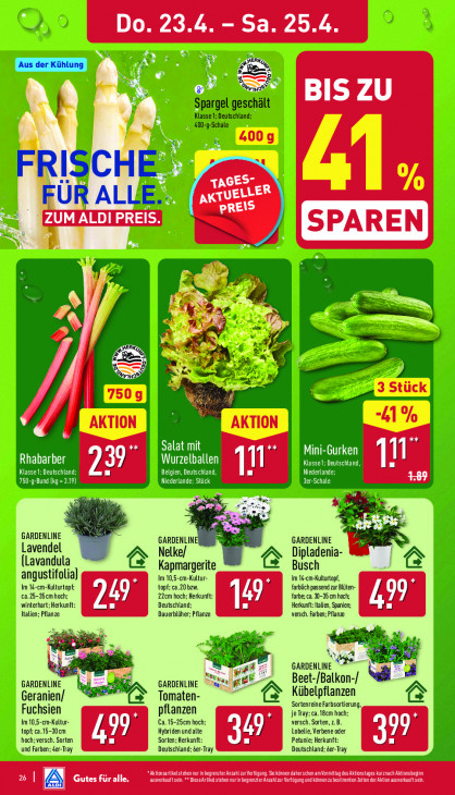 Bitte beachten Sie, dass dieser Text automatisch generiert wird und möglicherweise Fehler enthältDo. 23.4. - Sa. 25.4 ur Aus der Kühlung = G Les BIS ZU Spargel geschält N Klasse 1; Deutschland: 400-g-Schale 400g NJ FRISCHE TAG 32 % LLER FUR ALLE KTUE PREIS Ps AA Q A 5 F CO € 5 we / "er La és a ns 4 Dn: RER, È Dr == = ge 5 3 Stück 750g 41% AKTION AKTION ES =S ve # GARDENLINE GARDENLIN! GARDENLINE Lavendel Nelke/ er (Lavandula R 2 Dipladenia- (2 Kapmargerite Busch angustifolia) Im 10,5-cm-Kultur- Im 14-cm-Kulturtopf, Im 14-cm-Kulturtopf: topf 20 bzw. farblichpassend zur Blüte ca.25-35 cm hoch: 22cm hoch; Herkunft: farbe; ca. 0-35 cm hoch; 99° winterhart; Herkunft: 249 Deutschland 149 Herkunft: Hallen, Spanien Italien; Pflanze Dauerblüher; Pflanze versch. Farben; Pflanze X F GARDENLINE \ Rap, GARDENLINE GARDENLINE un Ge Beet- nn / rie Kübelpflanzen Geranien/ € Tomaten- R Sortenreine Farbsortierung, Fuchsien pflanzen je Tray: ca. 18cm hoch Im 10,5-cm-Kultur- Ca. 15-25cm hach: versch. Sorten, z.B topf.ca.15-30cm Hybriden und alte 19 Lobelie, Verbene oder hoch; versch. Sorten 77} Sorten; Herkunft: Petunie: Herkunft: und Farben; der-Tray Deutschland: Tray Deutschlanı er-Tray ELIEN er Anza ur Ver DIR OT ach DE E23 Gutes für alle. ausverkauftsei EN Te TOME nen u bestimmt aus