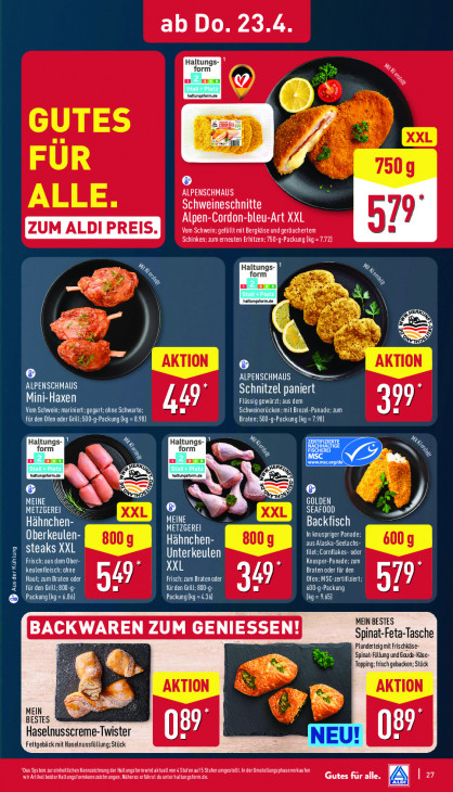 Bitte beachten Sie, dass dieser Text automatisch generiert wird und möglicherweise Fehler enthältab Do. 23.4 Haltungs- form 8 7 a, u Zen % hatungstormde ® @ ee GUTES + FÜR NS KENIS ALLE. Schweineschnitte Alpen-Cordon-bleu-Art XXL Vom Schwein; gefüllt mit Bergkäse und geräuchertem [ZUM ALDI PREIS. Schinken; zum erneuten Erhitzen; 750-g-Packung (kg = 7.72) %, Haltungs- el form 2 er Es un Zen Ex. % N hatungstormde à MERK, Kr & ke. en Re = Li 11954 LE: 6 N AKTION un ALPENSCHMAUS = = ALPENSCHMAUS Schnitzel paniert zie Mini-Haxen 49 Flüssig gewürzt; aus dem 99 Vom Schwein; marinert;gegart;ohne Schwarte: Schweinerücken; mit Brezel-Panade; zum ARTE TNT) Braten:500-g-Packung (kg =7.98) Haltungs- form %, Haltungs- form u 5 > a un Zen N mm Sen matunostormde haiungstorn de ER à = 5 6 MEINE der GOLDEN zin METZGEREI SEAFOOD MEINE ” Hähnchen: METZGEREI Backfisch Oberkeulen- In knuspriger Panad Hähnchen- aus Alaska-Seelachs- steaks XXL Unterkeulen filet; Cornflakes- oder Frisch; aus dem Ober- STATE keulenfleisch; ohne Ln Braten oder für den Haut; zum Braten oder Frisch; zum Braten oder Ofen; MSC-zertifiziert; ik] ‚AusderKühlung in 547 MTS 3 NN @ Packunglkg=6.86) Packung(kg=4.36) {kg = 9.65) MEIN BESTES [5 A EL ZUM GENIESSEN! Spinat-Feta-Tasche Plunderteigmit Frischkä nr Spinat-Füllung und Gouch-Kä Topping; isch gebacken; Stück AKTION AKTION MEIN ye BESTES Haselnusscreme-Twister Fettgebäck mit Haselnussfüllung:Stück "Das System zureinhitüchen Kennzeichnung der Haltungsform wir aktuellvond Stufen auf5 Stufen umgestllt.In der Unstellungsphaseverkaufen DATE CTI ECT Un Gutes für alle, A 2