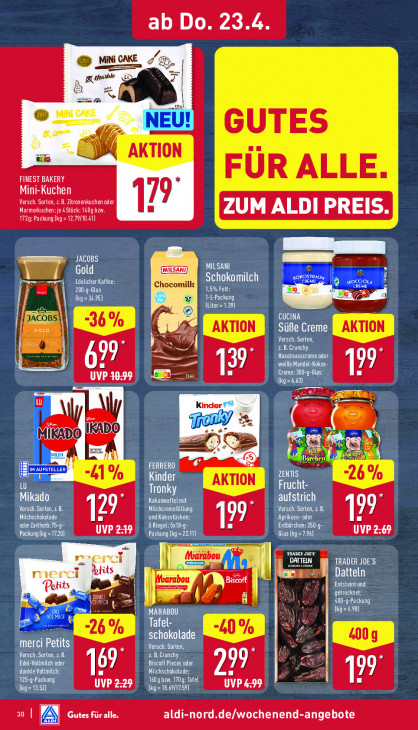 Bitte beachten Sie, dass dieser Text automatisch generiert wird und möglicherweise Fehler enthältab Do. 23.4 Cl æ MN CAKE 74 5 se A ginesble 2 je a | NEU GUTES SN AKTION FINEST BAKERY FÜR ALLE. Mini-Kuchen VEEN AN ONE Te CE 79 DETTE TANT 1729; Packung (kg = 12.79/10.41) JACOBS MILSANI 5 it) ns Löslicher Kaffee; Chocomilk BC] A) N CT Ne NRE 1,5% Fett: EEn (TERRA 1L-Packung (Liter =1.39) OB: ALT ET) 7 Süße Creme ] ALERT CR 2.B.Crunchy 99 gn Haselnusscreme oder ng weiße Mandel-Kokos- y} QE Tr TE 13 Creme; 300-9-Glas ar] = w ‘Kinder B em; ze KADO ai MIA po | > Kst 305 Mich Hat Ek LAS (de FERRERO CET) ZENTIS 4% Kinder 2 6% Tronky Eg ne Kakaowaffel mit aufstrich Versch. Sorten, z B. IS KRETA Milchschokolade LA und Keksstücken; Aprikose- oder [44 Cros EL en 19 EEND MCL) UVP 2.47 Packung (| 2211) CETTE) QE > Erten r Run LUN CE un rr Ï = TR PS A Datteln arabou m Entsteint und getrocknet; \ CH EREN MARABOU Te] 3 wa Tafel- schokolade KO merci Petits KENT R CI Versch. Sorten, z. B. NOT N Edel-Vollmilch oder Biscoff Pieces oder 99 KILIAN 6) Milchschokolade; ENE UTC) 17 TAN ET: ROTA VER UVP 4:99 aldi-nord.de/wochenend-angebote ETM A] Gutes für alle.