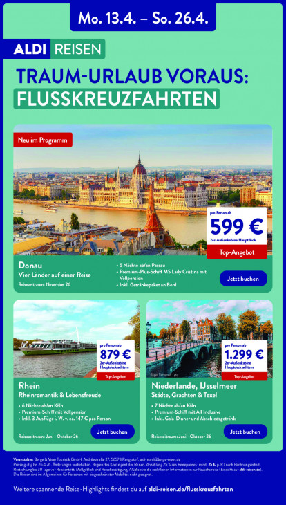 Bitte beachten Sie, dass dieser Text automatisch generiert wird und möglicherweise Fehler enthältMo. 13.4. - So. 26.4. ALDI TRAUM-URLAUB VORAUS: ER er Ei an i Fi su a ei) IM af Us LO eu pro Person ab HER 2 zl = 599 € Î 2er-Außenkabine Hauptdeck Pi il fi 2 h en Top-Angebot me il a SEE PET me 17 et cl din pro Person ab Be pro Person ab 879€ } 1.299 € = Zer-Auflenkabine Zer-Auflenkabine Hauptdeck achtern Hauptdeck achten Top-Angebot HE Veranstalt GmbH, Andröes engs li-nord@berge- Preise gükig bi Ände n. Be ingent d DER ET) De LE or Reiseantri Fi Reis En ie recht DAT 1 halreise (Einsicht auf aldi EN Di einen für Pe Er De TT rs Weitere spannende Reise-Highlights findest du auf aldi-reisen.de/flusskreuzfahrten