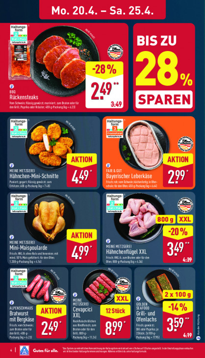 Bitte beachten Sie, dass dieser Text automatisch generiert wird und möglicherweise Fehler enthältMo. 20.4. - Sa. 25.4. Haltungs- un form Ce a Sen € DR bu G maltumgsormde EN > FS y SK ERA BIS ZU en ei =) TE Pr Re) SS bam £ | 8% , à 28 Y BBQ 49" Rückensteaks Vom Schwein; flüssig gewürzt; mariniert; zum Braten oder für den Grill; Paprika oder Kräuter; 400-g-Packung (kg = 6.23) Haltungs- I %, Haltungs- L form form a Sen a El Ta du hatugstormée altungstorm.ce SR CE Ja f = u Le: à 4 | # , AKTION MEINE METZGEREI FAIR & GUT Hähnchen-Mini-Schnitte 19 Bayerischer Leberkäse Paniert; gegrtflüssig gewürzt; zum Frisch; roh; vom Schwein; küchenfertig; in Ofen- 2 Erhitzen; 600-g-Packung (kg = 7.48) Schale: für den Ofen; 450-9-Packung (kg= 6.64) en Haltungs- form %, Haltungs- form a 7 MERK Cn % RK u Zen a Zen EE hatungstormde 5 atungtorm.de 7 ir 8 VG 800 9 | XXL | N MEINE METZGEREI Ka MEINE METZGEREI Mini-Maispoularde hg Frisch; HKL A; ohne Hals und Innereien; mit 99° Hähnchenflügel XXL mind. 50 % Mais gefüttert; für den Ofen; Frisch; HKL A; zum Braten oder für den 1.200-9-Packung (kg 16) Ofen; 800-g-Packung (kg =4.36) Haltungs- My, 7 form 2 d a Sen PA Ka MERK EF Ko, A hatungstorm.de =) # ke ie = ke > Ke > A MEINE METZGEREI GOLDEN ALPENSCHMAUS SEAFOOD Bratwurst Cevapcici Grill- und Eu AL Here Hackfleischröllchen Ofenlachs Frisch; vom Schwein; aus Rindfleisch; zum EN zum Braten oder für 19 Braten oder für den Dill oder Paprika: je CLOS EE 827 VEL SR N 35 Ld Packung (kg = 6.23) Packung (kg =11.24) TE) LT en WEVER ENE RE 4 | ir Artikel beider Haltungsformkennzeichnungen. Näheres erfährst du unterhltungsform.de. A Gutes für alle.