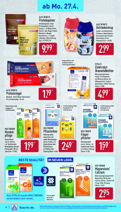 Bitte beachten Sie, dass dieser Text automatisch generiert wird und möglicherweise Fehler enthältALDI SPORTS PTS Proteinpulver Getränkepuiver: haher ALDI SPORTS Proteingehalt:versch. Sorten, B. Whey Protein ei Getränkesirup PROTEIN Vanille- oder Vegan Protein POR Zucker- und kalorienfrei; DELUXE re Haselnuss-Nougat- ie eerd Schwarze-Johannisbeere- LI LORIE æ ou RTS Geschmack: z.T.vogan: KE Geschmack oder Pfirsich- 420g bzw. 450g: Packung NE ar ‚Geschmack; 65-ml- (Kg= 2379/2220) RU Packung liter = .00) ho: BL current ru ET frite D =} Pa Am wi Ben, B 2 Krüger Gmb Co. KG Senefelderstrañe dd PTE 51469 Bergisch Gladbach VITALIS . EGEL dl EILLED En IN RIEGEL & Elektrolyt- Sn un Brausetabletten ze Fr E RER Eloctrolylust Nahrungsergänzungs- | QU = mittel’; mit Vitaminen u | und Mineralstoffen; mit ENT IT TE Be © an 8 Süßungsmittel;Tropical- = Geschmack: 3x2Der-Packung (Stück 08) ALDI SPORTS Proteinriegel Blaubeer- oder Erdbeer-Geschmack; me a 4 99 45-g-Packung [kg = 26.44) 22 Medizin Natura GmbH zz Proimiealthcare GmbH ProDimiHealthcare GmbH Langgasse 42 PLASTER STRIPS KirchhärderStr.29 KirchhädeStr.29 ‘65183 Wiesbaden 4229 Dortmund FINGER 46229 Dortmund: Sb ee Cb) PLASTERS me ai murnscnaur wärme Er oo PLASTER STRIPS FI El PLAST! C MULTINORM MULTINORM A Pflasterbox MULTINORM Muskel- Mediznprodukt; 0 Finger- pflege wasserfest; mil ke Kosmetikum; großer Wundauflage: pflaster versch. Sorten, versch. Sorten, z. B. Medizinprodukt; 2.B. Teufelskralle- Kinderpfaster oder versch. Sorten, z. B. Muskelpflege-Geloder Pflasterstips; iN ‚Sensitive oder Elastic; Pferdesalbe; 100-ml- je2 Größen; 0er je16 Stück; Packung Tube (Liter =19.90) Packung(Stück =0.06) (Stück =0.10) Ze MULTINORM Br Magnesium, “u vi & w MAGNESIUM Calcium Cglelum 400 ma Re Nahrungsergänangsmittel: Magn um | a 7 En Magnesium 250 mg oder 250 mg A Q En Calcium 400mg + Vitamin D3 > oe. SS 7 2,5 pg; 150er-Packung Vitalis MULTINORM (Stück = 0.02) ze 150 aa ts | er K en ” Pharcona GmbH H EB zu inne Benzstraße1 (8693 Ahaus En