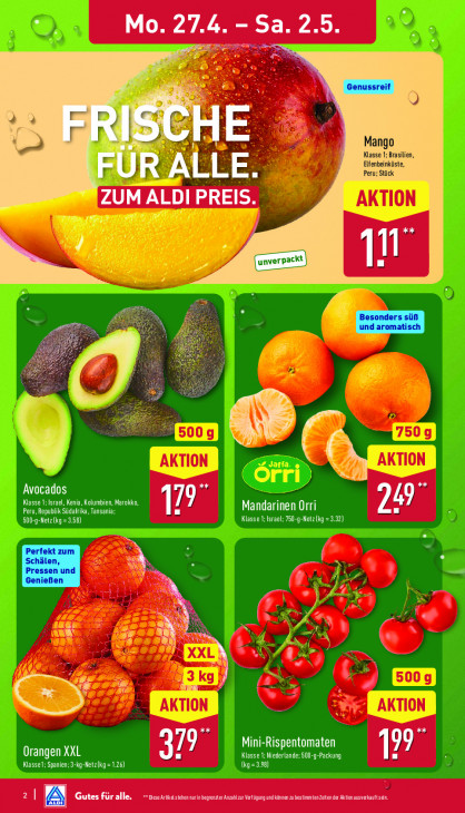 Bitte beachten Sie, dass dieser Text automatisch generiert wird und möglicherweise Fehler enthält5 5 Mo. 27.4. L BE 7 Sa. 2-3. Et € LT Mango Klasse 1; Brasilien, Elfenbeinküste, EUR ALLE. Peru; Stück 2 M ALDI EN ih A F. (pp, RS \ = SS ij rs Avocados Klasse 1; Israel, Kenia, Kolumbien, Marokko, in Mandarinen Orri Peru, Republik Südafrika, Tansania; Klasse 1; Israel; 750-g-Netz (kg = 3.32) zn EON ELL où % "4 s=4 PS a" * hd Re f A Erm = Mini-Rispentomaten 99 Orangen XXL LA Klasse 1; Niederlande: 500-9-Packung Klasse1; Spanien; 3-kg-Netzikg= 1.26) CN) a Gutes für alle, DAT CP D CA und können u bestinmten Zeiten der Aktimausverkauftsen.