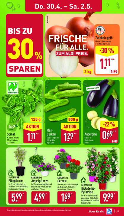 Bitte beachten Sie, dass dieser Text automatisch generiert wird und möglicherweise Fehler enthältOD Do. 30.4. - Sa. 2.5. Mi Klestelt SD \ Re À 7 5 5 | ) ) ! à 7 ya BIS ZU 4 $ Ei 9 FRISCH LLE. ZUM ALDI PREIS. nm“ +59 y TA RE m ma) [unvorpac] Nat ind j "Ha 7) fi nt bio @ Mini- Gurken LERNT N ** Klasse1;Spanien: 29 CLS Klasse; 40” 500-g-Netz | Niederlande; kg= 2.50) Stück 6-89 Fe EX N A > de A Li 2 ET ‘+ 2 #* GARDENLINE GARDENLINE GARDENLINE Pfingstrose Geranie Im 19-cm-Kulturtopf: Ampelpflanze RB 30-55 cm hoc! interhart; Deutschland; versch. Sorten Im 25-cm-Ampeltopf: Herkunft: ca. 28cm hoch; Herkunft: ‚Stehend; im 12-cm-Kulturtopf; GARDENLINE Freilandware; Pflanze und Farben; Pflanze Deutschland; Pflanze | Dipladenia- Pyramide Im 18/19 -Kulturtopf, passend zur Blütenfarbe; 49 Dauerblüher; ca.80-90cm ‚hoch; Pflanze BAANT ET TT Tee Tee TTET Gutes für alle. A EF