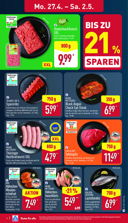 Bitte beachten Sie, dass dieser Text automatisch generiert wird und möglicherweise Fehler enthältMo. 27.4. - Sa. 2.5. Haltungs- RS % Er natungstorn.se vt N N) 5 BIS ZU N N N hed SS à NN! À AN NS te N N N Hi Y fi ES 3 2 99 ig Haltungs 072 4, form Fa 2 > a Sen tungsten (9 Pt 6 MEINE KE) METZGEREI Spareribs Black Angus B Kotelettrippe vom Schwein; flüssig gewürzt; Chuck Eye Steak vorgegart: mit Honey-BB0-Marinade: für den Vom Black-Angus-Rind: mariniert; zum Braten Ofen oder Grill; versch. Gewichte; ET MT ‚oder für den Grill; versch. Gewichte; z. B. 350g 67 (kg= 799) TANT] u Haltungs Vu, Haltungs- form %, form x un en = % Te hatunostorm de LR hante. CR £ L © & 2: = IS Ve. uns VA 800g MEIZGERE FAIR & GUT Thüringer Rostbratwurst XXL Tafelspitz 79 Vom Rind; küchenfertig; zum Kochen und Frisch; vom Schwein; grob; zum Braten oder für Schmoren; versch. Gewichte; z. B. 750g (LE: den Grill: 800-g-Packung (kg = 5.99) (kg=15.2) Haltungs- Haltungs Mit Herstelt EIEREN form CU erstellt form Im Sen un Zen © Le matungsormde js DE aungstormae > Fe > È =: BBQ ie | £z cl SS e = S En Hähnchen- Meilen Lines Hähnchen- 2 1% GOLDEN CALE SIN] Frisch;aus dem Innenfilets CL Brustfilet; mariniert, Frisch; aus dem Brust- Lachsforelle mit Grillbutter; zum filet: zum Braten hg Tears Braten oder für den coder für den Grill: küchenfertig:versch. en 149° Nee CAEN 67 Packung (kg = 9.36) tkg=915) ET] CY WEE VOR PEN DE RE 4 | Gutes für alle. wirArtikel beider Haltungsformkennzeichnungen. Näheres erfährst du unter haltungsform.de. A