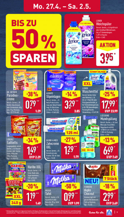 Bitte beachten Sie, dass dieser Text automatisch generiert wird und möglicherweise Fehler enthältMo. 27.4. - Sa. 2.5 LENOR JETZT #20% INHALT BIS ZU Weichspüler Versch. Sorten, z.B. Aprilfrisch VETT INHALT oder Amethyst Blütentraum > Er NENNE) 5 4 1,491-LFlasche u enor (Liter = 2.65) pres mu lenor, nk AKTION Vo za Eu ar em HP, 395 Cad 76 PODS* XXL PACK JB Ca a fader 5 Er pier 100 Creme fa Der Crea Te, TD Els ê % Luc li ST ee GE XXL LENOR DR. OETKER Waschmittel % ALWAYS KES n Us 72 5% Paradies- Slipeinlagen oder Universal, z. B. creme Versch. Sorten, z.B. Eg KEEN Vanille-Geschmack DailyProtectextra Flüssigwaschmittel:je Long oder Daily Protect 20” Ren EE NT 079 Long: 54 Stick ba AAE en 1799 ERN US Packung EME UVP 23-99 [Et] (Stück = 0.06/0.05) Cet) LISTERINE CET) 24 56 Le STE lend-amed) Versch. Sorten, z. B. Cool er Mint oder Fresh Mint jr sa “x Doppelpack enthält FILE fase | blend'amedE} eend be 1x 500ml und 1x 600ml; RARE TON 125 ml ASTER, (GE) re ei 34 % BLEND-A-MED Saltletts Zahncreme ISTERIN: Laugengebäck: versch tt Sorten, z. B. Pausen- XXL zoom Cracker oder Junior- Versch. Sorten, z.B. 29 HEN DUO Extrafrisch oder 49 Farm: 1009 bav. 149 Kräuter; 125-ml-Tube 150g: Packung NLs (liter =10.32) UVP 7-49 (kg = 14.90/9.93) = SAVER Haribo XXL 4 2: Versch. Sorten, z. B. T2 ef POS" an ACTA Superwummies A 340-9-Beutel de fee) 7 Stück ARIB Color-Rado 77 FERREI MILKA duplo Tafel (ALTO Versch. Sorten, z. B. Schokoriegel mit Enr es 99 ganzen Haselnüssen: 99 119 Noisette; 0-g-Tafel UVP 499 Ton UVP 3-69 (EU) CERTA] Aktionsartikel stehen nurin begrenzter Anzahl zur Verfügung. Sie können daherschon am Vormittagdes Aktionstages kurzrach Aktionsbeginn ausverkauft sin.** Diese Artikel stehen nurin begrenzler Anzahl zu Verfügung und könne zu bestimmten Zeiten der Aktion ausverkauft sein Gutes für alle lo