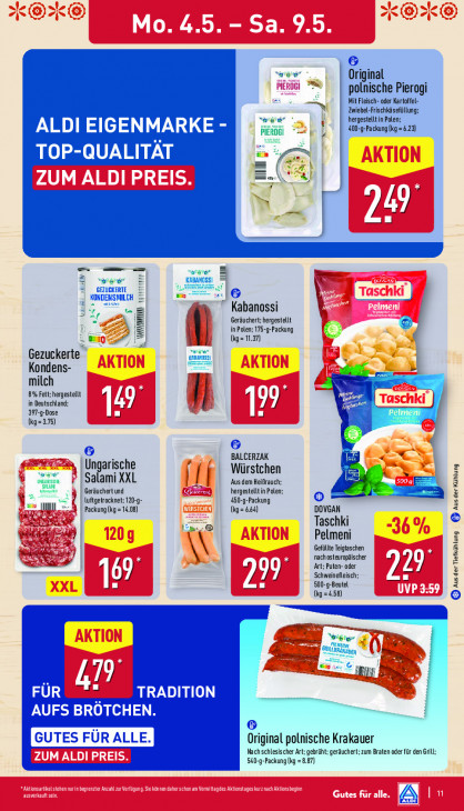 Bitte beachten Sie, dass dieser Text automatisch generiert wird und möglicherweise Fehler enthält© wis Original polnische Pierogi Mit Fleisch- oder Kartoffel- Zwiebel-Frischkäsefüllung; hergestellt in Polen: A DI EIGENMARKE - PIERDEI 400-g-Packung (kg = 6.23) TOP-QUALITÄT j L 5 ver wi © = (ss! GEZUCKERTE 3 .| KONDENSMILCH 5 EN m | m = Kabanossi Geräuchert: hergestellt © in Polen; 175-9-Packung } KEI | (g= 11.37) Gezuckerte Kondens- a milch in Deutschland; 8% Fett; hergestellt > ir 2 ns | 77 Ll tkg=3.75) 397-g-Dose | [ 6 BALCERZAK Ungarische Würstchen WREE ese Salami XXL en [| ‚Aus dem Heißrauch; a Geräuchert und hergestelltin Polen; © == Luftgetrocknet; 120-9- 450-9-Packung DOVGAN pe Packung (kg = 14.08) (kg = 6.64) 2 ® Taschki Pelmeni \\ Gefülte Tigtaschen Le Co 3 Art; Puten- oder nachosteurapäischer Schweinefleisch = ij LL LT 500-g-Beutel 5 Em el (lg =4,58) © aus derTetkühtung Aus der Küntung er Abn CP Alg un à À a7 TRADITION nn AUFS BRÖTCHEN. Original polnische Krakauer Nach schlesischer Art; gebrüht; geräuchert; zum Braten oder für den Grill; ZUM ALDI PREIS. 540-g-Packung (kg = 8.87) A