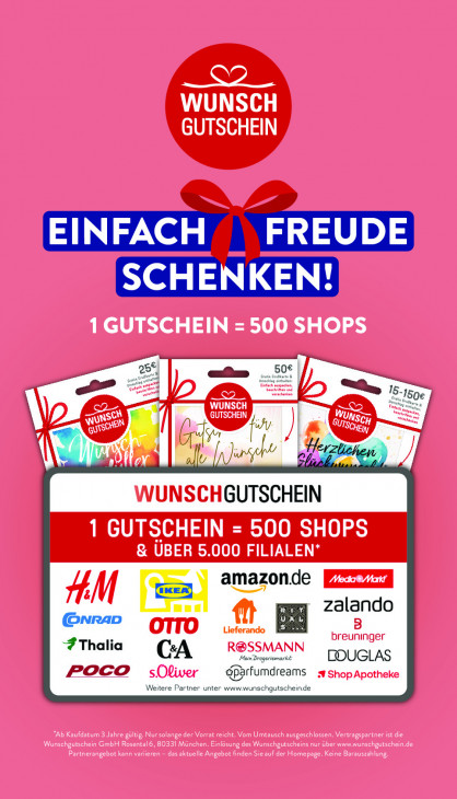 Bitte beachten Sie, dass dieser Text automatisch generiert wird und möglicherweise Fehler enthältEINFACH FREUDE SCHENKEN! LL le De nu! NSC GUTSCHEIN Pre GEN WE Gi MT \ 24177 1 GUTSCHEIN = 500 SHOPS & UBER 5.000 FILIALEN amazon de El UM ee ONnrap m. m zalando Ka inger 7 Thalia CA R@SSMANN Mein Drogeriemarkt: DOUGLAS Poco sOliver ROER E A ShopApothek Weitere Partner unter www.wunschgutschein.
