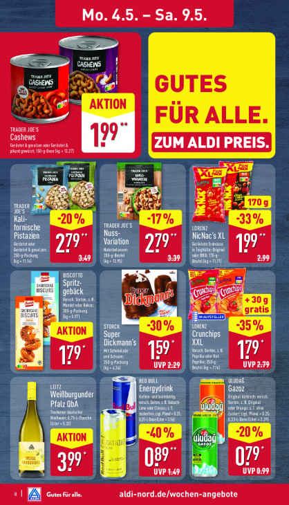 Bitte beachten Sie, dass dieser Text automatisch generiert wird und möglicherweise Fehler enthältMo. 4.5. - Sa. 9.5. 5 TRADER JOES Ze ! — ' CASHEWS rl P TRADER JOES C4 H CA tide Ge IN GUTES @ AKTION FÜR ALLE. Na Bl Cashews Geröstet & gesalzen oder Gerästet & 129 pikant gewürzt; 150-g-Dose (kg = 1.27) ee nn | Des Frau ner perte = DCE PISTAZEN LS TS M ES a) = N Fa pa = D) IN à 5 len mig TRADER NS pik she iM “fl A LEI 2 0% LUN) 17% fornische LORENZ Pistazien IER NicNac's XL Gerüstet oder Variation Geröstete Erdnüsse Geröstet&gesalzen: Naturbelassen; in Teighülle; Original NE KIEREN CRUE (kg=1146) Zn (kg = 13.95) Zu Beutel (kg til) EM zE a ker BISCOTTO mr SHORTCAKE Spritz- id BISCUITS 3 AND, gebäck Us k se CA Bag = Versch. Sorten, z.B. Mandel oder Kokos; onde = +309 SHORTCAKE. el BISCUITS, 300-9-Packung ae De gratis TEEN STORCK -30 % LORENZ AKTION ST [AN Dickmann's XXL ( Mit Schokolade Versch. Sorten, z. B. und Schaum; 19° Paprika oder Hot 17 @ 17 IRN EEE > EI 072: Beutel (kg =716) NL es LEURS pement ant ULUDAG En MOT LES Gazoz Weißburgunder Koffein- und taurinhaltig; Original türkisch; versch. Pfalz QbA versch. Sorten, z.B. Sudachi- Sorten, z. B. Original Trockener deutscher ul Lime oder Class 322 lu TERCERA Weifwein;0,75-L-Flasche Re Nd CP a) Rn (Liter=5.32) 0,25-L-Dose (Liter= 3.56) 0,33-L-Dose (Liter = 2. LYS lu ESE IK IE LES UVP 8-99 IE aldi-nord.de/wochen-angebote EN A] [RL TEN