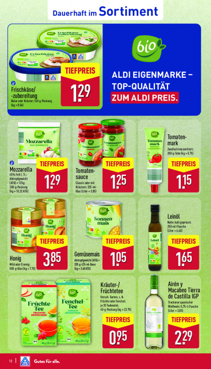 Bitte beachten Sie, dass dieser Text automatisch generiert wird und möglicherweise Fehler enthältDauerhaft im Sortiment Ke = winch bio A ALDI EIGENMARKE - B Frischkäse/ TOP-QUALITÄT y 7 -zubereitun Natur oder Kräuter: 160-g-Packung | (kg =8.06) en lozzarella Tomaten Tomaten- AUS KUHMIICH | © lime mark E Tomatensauce zo, in Zweifach konzentriert; Le © zl De 200-g-Tube (kg = 5.75) me | 6 + mn = 2 Mozzarella Tom aten- 45% Fetti.Tr.; sauce Abtropfgewicht (ATG) = 1259: Classic oder mit Ja 200-g-Packung [ 5 = Kräutern; 325-ml [ CR [ | J (kg=10.32AT6) Glas (Liter = 3.85) E = Sonnen- Leinöl mais Nativ;kalt gepresst; f Honig 250-ml-Flasche = Le (Liter = 6.60) = Honig el Gemüsemais =d Honig gf | J Abtropfgewicht (ATG)= — & ) Mild oder Cremig: J 7 285 g; 425-ml-Dose [ = [ i 500-9-Slas (kg =7.70) (kg=3.68 ATG) = me Kräuter-/ Airen y I Früchtetee Macabeo Tierra @ r Versch. Sorten, z.B. de Castilla IGP Fenchel- | Früchte oder Fenchel; Trockener spanischer Früchte- En je 20 Tecbeutel: Weißwein; 0,75-L-Flasche Tee AROMATISCH west 40-g-Packung (kg = 23.75) (Liter = 3.05) © N > = N | ’ J ja 7 9 40g(20x2g) | L mm ns Er.