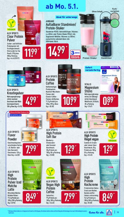 Bitte beachten Sie, dass dieser Text automatisch generiert wird und möglicherweise Fehler enthältFarb- Ohne Inhalt varianten ern, AMBIANO EE a BE | Pe Aufladbarer Standmixer/ VEGAN es Protein-Shaker Standmixer PC552, Edelstahlklingen, Volumen: ALDI SPORTS WHEY, ‚ca.400ml, oder Protein-Shaker PC562, inkl. Clear Protein ‚Supplement-Behälter, Volumen: ca. 500 ml: auslaufsicher; akkubetrieben; inkl. Pulver USB-Kabel; Stück Zucker- und fettfreies Proteinpulver mit Fruchtgeschmack: Cherry oder Ice Tea Peach; 270g bzw. 300g; Packung (kg=44.41/39.97) SE | ‘Standmixer @) ZREATINE ALDI SPORTS PROTE UN ULVER FE Magnesium Sticks a ee) Protein PROT En Coffee COFFEE er zo LE) En VITALIS Koffeinhaltiges Magnesium ALDI SPORTS Proteinpulver: i Hazelnut-Macchiato- Sticks Kreatinpulver Flavour oder Nahrungsergänzungs- Nahrungsergänzungs- Classic-Coffee- mittel: mit Süungs- mittel; neutraler Flavour; 8 bzw. mittel; Geschmack ‚Geschmack oder Wald- Tg Pr in pro Waldfrucht; 20 Stück; 89 beerengeschmack; 19 1009: 390-9-Dose 30-9-Packung 200-g-Dose (kg =24,95) (kg =2818) = 29.47) en “ bien = me ERIEGEL JO PR GEL Do 2 FH RIEGEL LIN LE] En CAT en = PRO meae ARIEGEL ALDI SPORTS ALDI SPORTS ALDI SPORTS High Protein 7 Flavor & Soft Bar High Protein “ater Powder \ E Cheesecake- Blueberry- Cookies-&-Cream- Riegel vegan GAI Geschmackspulver: ‚oder Caramel- ‚oder Lemon-Cake- 2.8. Vanille- oder verschiedene Sorten, Geschmack; Salz-Karamell- Geschmack: 250 309 Protein pro Protein pro 100g: Geschmack: 120-9- 799 1009; 50-g-Packung 55-9-Packung Dose (kg = 6658) (kg = 25.80) (kg =2345) - za oT: ren BI) ALDI SPORTS GH HO ER OTEIN PE ALDI SPORTS KOCHCREME Ad \ High Protein VEGAN High ALDI SPORTS Protein Pulver Iced za) Matcha Vegan High Kochereme co Protein Proteinreicher Sahne- Latte Ersatzzum Kochen, Mitechtem Matcha- Coffee Backen undVer- Grüntee-Pulver; Zuckerfrei; feinern; extracremig; 715 gProten pro iN 719 Protein pro 99 76,19 Protein pro IL 100 9: 250-9-Packung 1009: 300-9-Packung 109: 300-g-Packung (kg=3396) (kg = 26.63) {kg= 28.30]
