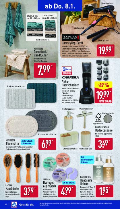 Bitte beachten Sie, dass dieser Text automatisch generiert wird und möglicherweise Fehler enthältHaartrockner ab Do. 8 Stück, B xL: 2Stück, Bx L: ca. 70 x 140cm je ca. 50 x 100 em Eockenstab pr. [au EMI Farbvarianten Haarglätter Haarstyling-Gerät In den Modellen Lockenstab C12003, mit NOVITESSE Keramikbeschichtung, Haarglätter 52033. ‚Aufheizzeit: 30 Sek., oder Haartrockner Duschtuch/ 02003, 1.900W, mit 2 kombinierten Heiz- und 199 — Handtücher Gebläsestufen, inkl. Stylingdüse:Stück teine Baumwolle; „ es Packung “u Sr >> 799° | " CARRERA we Akku- BxL:ca. 60x90 cm Haarschneider Modell RFC-695; Keramik- Klinge: LED-Display: 7 Aufsätze: 0 | Feineinstellung LA ca.0,5-2,5mm; ‚A Betriebs zeit: ca. 120 Min. inkl. Zubehi tick Seifenspender Duschabzieher == = > Farbvariante FSC Bambus ER ‚Applikationen HOME CREATION Badaccessoire BxL: ca. 60 x 100 cm Mit Bambus-Applikation: tic NOVITESSE JA Badematte LS 4 + Obermaterial 100% Polyeste ‚as chbar; U. für Fußbodenheizung geeign stück Utensilienhalter Wattepad-Box acura ARE ( (a Em +. = LacuRs HypRoGe Deras LACURA SPA ge: LACURA & Handseife LACURA Hydrogel- Deluxe Augenpads Elegance, mit Yang- & Haarbürste Inden Sorten Waterliyduft oder G Fassung Bambus: 37 Kollagen, Vitamin C 7 Pure, mit Neroli 5 verschiedene Modele: ader Hyaluron: Oer Tu Jasminduft; 300-ml- [ Stück Packung (Stück -0.08) Spender (Liter = 6.50) stehen nurinbegrenzter Anzahl zur Verfügu CENTRALE tages kur na EL} Gutes für