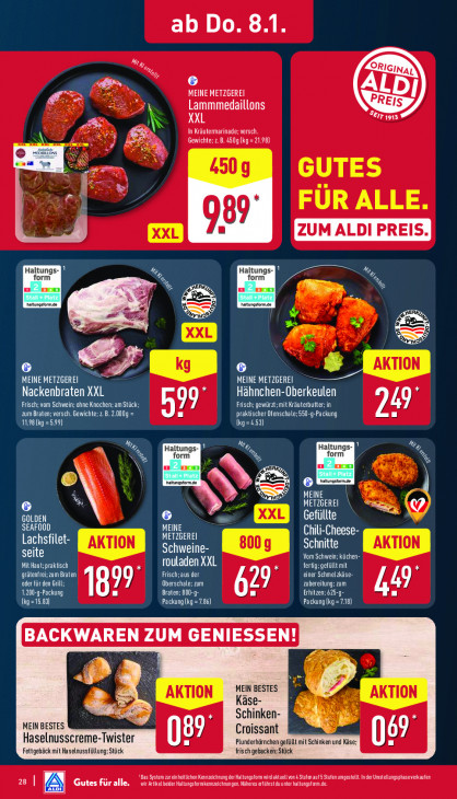 Bitte beachten Sie, dass dieser Text automatisch generiert wird und möglicherweise Fehler enthältab Do. 8.1. Mit, CE? I MEINE METZGEREI ALDI Lammmedaillons XXL Dre N In Kräutermarinade; versch. Gewicht: zB. 460g (kg = 21.98) © GUTES 450g ES) eN FÜR ALLE. 89 M ALDI PREIS = Haltungs- 9 My, un Zen un Zen Haltungs- a Ki ESE hatungstormde hatungstormde 7 3 4 2 5 à je: Birne > 6 MEINE METZGEREI MEINE METZGEREI 3 * 0 Nackenbraten XXL Hähnchen-Oberkeulen Frisch; vom Schwein; ohne Knochen; am Stück ; 99 Frisch: gewürat:mit Kräuterbutter: in ‚zum Braten; versch. Gewichte; z.B. 2.000g = praktischer Ofenschale;550-9-Packung VE HOTTE) (kg=453) à À 7 Haltungs- 7 Haltungs KA a form % Re In en un Zen Fe natungtorm.e natungstorn.de, > Fi à MEINE 4 METZGEREI \ lc nat SUN) Chili-Cheese- Lachsfilet- HG SAUTER SAULT SC Vom Schwein; küchen- Eu Mit Haut praktisch rouladen XXL fertg:gefüllt mit grätenfrei;zum Braten Frisch;aus der einer Schmel zkäse- ‚oder für den Grill; WEST] 29° ENE ul NNT [222 Braten; Erhitzen: 625-9- 7 CRU Packung (kg =7.86) Packung (kg =7.18) a EN al P AKTION MEIN BESTES AKTION Käse- + Schinken- MEIN BESTES Croissant Haselnusscreme-Twister 69 2 Plunderhörnchen. gefült ‚mit Schinken und Käse; Fettgebäck mit Haselnussfüllung; Stück frisch gebacken; Stück "Das Syste zur einheitlichen Kennzeichnung der Haltungsfon wid aktullvond Stufen auf5 Stufen umgestellt In der Unstelungsphaseverkaufen LITE TON TT ETATS CA [A Gutes Für alle.