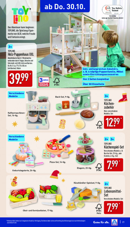 Bitte beachten Sie, dass dieser Text automatisch generiert wird und möglicherweise Fehler enthältN N Toy Safety\, (a / ab Do. 30-10. \ ie - / / wm. sehe dehert Ind u 8 at Das Abenteuer kann beginnen: TOYLINO, die Spielzeug-Eigen- Er | marke von ALDI, welche Freude u | | Li und Fantasie anregt. kl raaf el 3+ m A u À ae. TOYLINO x eb re Holz-Puppenhaus XXL ln ‚Abnehmbares Dach; 3 Stockwerke, verbunden durch Treppe, Rutsche und Fahrstuhl; mit LED-Licht und Garten; BxHxT:ca. 77x73 «55cm (mitGarten); Stück T Inkl. umfangreichen Zul rs, je Puppenfat „Möbel | & sowi es htungsaccess; Von 3 Seiten bespielbar à 09 HERSTELLER. GARANTIE FSC r 80 Ei le Verschiedene % Modelle Back-Set, 9-tlg. 3+ TOYLINO l'= b Küchen- n° E- | zubehör Kaffeemaschinen- Holz; verschiedene Set, 16-tlg. Modelle; Set rn / % D Verschiedene Modelle 2+ 3+ = TOYLINO Küchenspiel-Set EI Verschiedene Modelle z. B. ==} Burrito-Set, 23-tg., oder = = TV Eisdiele,6-tg.:Set Pizza-Set, 16-tlg = u u, Etagere, 23-tig. LD Geburtstagstorte, 24-tlg. FSC Käsehändler-Spielset, 9-tlg. 2+ TOYLINO Lebensmittel- ve Set > Verschiedene Modelle; Set 27 4 FSC Obst- und Gemüsekisten, 17-tlg. Holz A