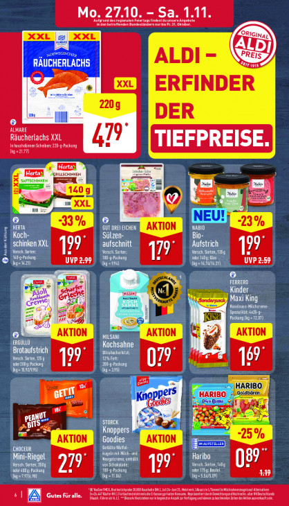 Bitte beachten Sie, dass dieser Text automatisch generiert wird und möglicherweise Fehler enthältMo. 27.10 Sa. 1.11 ‚Aufgrund desregionalen Feiertags findest du unsere Angebote in den betreffenden Bundesländern nur bis Fr. 31. Oktober. XXL laLMARE, s XXL DI RORWE. EL RÄUCHERLACHS ALDI - TES ® pa ERFINDER an 220 zu © DER 6 ii ALMARE Räucherlachs XXL 79 Inhauchdünnen Scheiben; 220-g-Packung (kg =21.79) sd — za Herta’! 4 GRILLSCHI M À rt 140 Een Habio | 2 EN NEU! [ld RTA 23% LEE AKTION NABIO Koch- Sülzen- Bio- schinken XXL aufschnitt Aufstrich LECTURE 99 KASSE CE Per En) 79 Versch. Sorten, 1359 199 © 160-g-Packung, AL ed De oder 140g:6las UVP 2:59 (AM) (REA) CTI © FERRERO MULSANIJ TC I If ant = 7 Maxi King eest Nass een | SEEN Packung ( 07) ca AKTION AKTION 68 MILSANI TN Kochsahne Brotaufstrich Ultrahocherhitzt; Versch. Sorten, 125 9 12% Fett: 69 oder 200g:Packung 199 EREN I Ben} (kg= 16921995) (kg =295) — TI HARIBO) A LE ers Pi es ir) Là Ke LL i | pt NU En ai 7 STORCK 2 21 2 (eol Knoppers 2 5% Goodies AKTION CM Gefüllte Waffel- EE) *+ EE LEERE CEE Haribo 89 VERN von Schokolade: Versch. Sorten, 160g oder 4009: Packung iR LC 199 CL CT) en) CET "DE YouGon FC, Brutostichprobe 2.00 Haushalte (MH. J24-Jni 25. Meistvrk.(AbsatzinL/Tonen]in Michrhmerzeugisse-Alematven Se eg ELT NEC NIN ENEN Leen TE sl A] Gutes für alle. LEMIGE EEL COTON