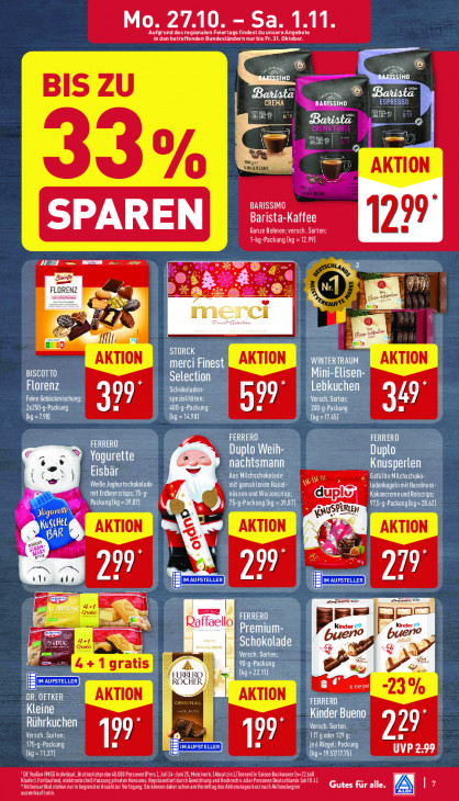 Bitte beachten Sie, dass dieser Text automatisch generiert wird und möglicherweise Fehler enthältMo. 27.10 Sa. 1.11 ‚Aufgrund desregionalen Feiertags findest du unsere Angebote in den betreffenden Bundesländern nur bis Fr.31. Oktober. a MD BIS ZU CREMA BARIS: Be 0 z ‚ESP! = EEn Cul LT nd Et — AKTION 3% BARISSIMO Barista-Kaffee Ganze Bohnen; versch. Sorten; 1299 1-kg-Packung (kg = 12.99) HI en x Disco ES 1 FLORENZ | = 8 ran à an Mia ple a EG) STORCK AKTION merci Finest WINTERTRAUM AKTION HEN) Selection (QE Florenz L akten Schokoladen- Feine Gebäckmischung; spezalitäten: 99° TA) TPE tn 999 SEN Bram 17 NE 349, CET) (4 RATE = FERRERO FERRERO 7 -® Duplo Weih- Duplo % KG nachtsmann — Eisbär = Knusperlen ETE KO Pi LEG INNE ‘Weifle Joghurtschokolade mit gemahlenen Has LE ladenkugeln mit Haselnuss NS LICE OU x nüssen und Wei 87) AA TS reite Packung (kg. > En 97,5-g-Packung (kg = 28.62) KUSCHEL, a RI 99 99 n ti «ls rer) ETES PI ÉD FE de. a Gratis | pied Raffaello, LT Premium- bueno Hef Schokolade bueno Gratis | Versch. Sorten: CB LÉ 4+1gratis [I Dr Pi y. ELI CHE) 2 3% DR. OETKER EN AKTION FERRERO Kleine KC AT) Rührkuchen EEE KEEP 99 HIT 229 KEN 199 IMAUFSTELLER je6 Riegel; Packung NL ed (TEEN) CEE) DE YouGov FAOS Individual, Bruttostichprobe 4.000 Personen/Pers., Juli24-Juni 25, Meistvrk. Ahsatzin L/Tonnn]in Saison Backwaren In=22.468 Käufe]orlaufen, elektronische Erfassung van Konsums. Reprösentrt durch Gewichtung und Hochrechn. ale Personen Deutschlands (18. Aktionsarike stehen nurin begrenzter Anzahlzur Verfügung. Se können daher schonam Vormittag desAktionstages AT Gutes für alle (lé ausverkauftsei