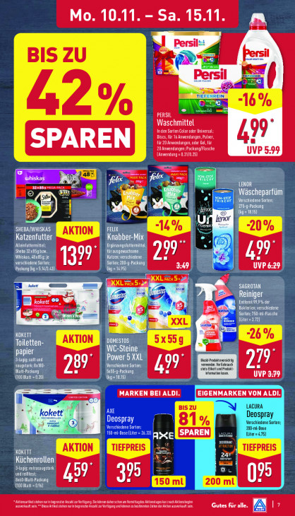 Bitte beachten Sie, dass dieser Text automatisch generiert wird und möglicherweise Fehler enthältMo. 10.11 Sa. 15.11 CR x Persil & 7 = ke an BIS ZU LES. © TIE 1 6% d G PERSIL Waschmittel In den Sorten Color oder Universal: 99 Discs, für 16 Anwendungen, Pulver, für 20 Anwendungen, oder Gel, für 20 Anwendungen; Packung/Flasche UVP 5:99 (Anwendung = 0.31/0.25) — ne — re Whiskas A ap ZA te Ex 32x859 fl B =] Wäscheparfüm LE Verschiedene Sorten; 2 = KE © 15) US, enor SHEBA/WHISKAS FELIX Katzenfutter Knabber-Mix Alleinfuttermittel; PTT TONER fi Sheba 32x85g bzu. fürausgewachsene Whiskas, 48x85g; je Katzen; verschiedene 99 199 KETTE 139 Sorten: 200-g-Packung Packung kg =5.14/343) EUX) Cora KE UVP 6:29 UE >. kokett XXL pac 5 KNAU 3308 omes Td ED koke! EN m Entfernt 99,9% der bs (4 Ce) ze Bakterien; verschiedene wog ee 28 En EUCH EEE Lias (Liter=3.72) EE KOKETT Toiletten- DOMESTOS y WC-Steine papier EREN Power 5 XXL Biozi-Produktevorsichtig saugstark: Bx180- Verschiedene Sorten; stets Aikettund Produkt verwenden. VorGebrauch VIC Blatt-Packung I EEEN LT 199 information lesen. (100 Blatt = 0.20) CAT] UVP 379 MARKEN BEI ALDI [EISENMARKEN VON ALDI. EIGENMARKEN VON ALD [ 17] BIS ZU LACURA kokett AXE ! Deospray Verschiedene Sorten; Deospray 81% Verschiedene Sorten; 3) 200-ml-Dose BEE (Lit >eLSPAREN] (Liter = 4.75) BEODORAKT TIEFPREIS KOKETT RAT r2 1 Küchenrollen 1) I Cr Hagigrextrasaugstark und reiBfest; OENE 173 395 200 ml {100 Blatt =0.96) Aktionsartikel stehen nurin begrenzter RN ET kurz nach Aktionsbegin ausverkauft sin.** Diese Artikel stehen nurin begrenzler Anzahl zu Verfügung und könne zu bestimmten Zeiten der Aktion ausverkauft sein Gutes für alle