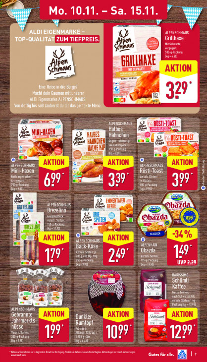 Bitte beachten Sie, dass dieser Text automatisch generiert wird und möglicherweise Fehler enthält7 Mo. 10.11 Sa. 15.11 A ALDI EIGENMARKE - ALPENSCHMAUS TOP=QUAEITAT ZUM TIEFPREIS Grillhaxe en Mit Schwarte:; Mau vorgegart 500-9-Packung [kg = 6.58) en GRILLHAXE aus IT SCHWARTE AT Kane Eine Reise in die Berge? Macht dein Gaumen mit unserer 29 3 ALDI Eigenmarke ALPENSCHMAUS. ra Von deftig bis süß zauberst du dir das perfekte Menü fase er ALPENSCHMAUS 7 RÜSTTOMST Halbes de EE Re pen MINI-HAKEN Hähnchen 0 AÜST-TOAST. nn ER Gegart;tafelferig an © AE mm vakuumverpackt (ed Eme CS = = KENT ss er [kg=9.69) or EDES ALPENSCHMAUS Mini-Haxen Rösti-Toast TEN Versch. Sorten Art; gegart LOT g° 750-g-Packung TOR PRE) DE PPO {kg=922)- EA x dns >, ENMENTMER a ALPENSCHMAUS us BERGE REZEUNO Sa Brezelino bä er À ) À > a < ä tipen LTÉE ET DE Ob } Ai as en dns IM { AMEZELI g= 1199) rr CE ; ‚ALPENSCHMAUS- Back-Käse ALPENHAIN Obazda | 19 Versch. Sorten: je RN hg ALERT CIE 149 ET aan TEA Tan] Ur En ee en ” BARISSIMO Schümli in LE hi = Ganze Bohnen: is _ EAR ALLA gt = versch. Sorten: 1-kg © Packung (kg=12.99) ALPENSCHMAUS Gebrannte RATS Jahrmarkts- nusse ECHT Rumtopf = Versch. Sorten 99 ‚Alkohol; 12% Vol. 9 TSN | = RUIEN NEL Fer {kg=9.95) TEE] ausverkauft se. Aktionsartikel stehen nurin begrenzter Anzahl zur Verfügung. Se können daherschon am Vomittagdes Aktionstages kurz nach Aktionsbegin Gutes für alle, A IK
