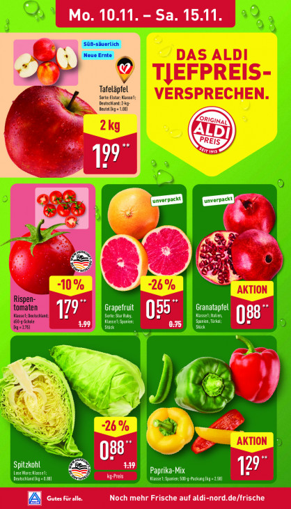 Bitte beachten Sie, dass dieser Text automatisch generiert wird und möglicherweise Fehler enthältMo. 10.11. - Sa. 15.11. ik — Tafeläpfel Deutschlant Sorte: Elstar; Klasse 1; kg- Beutel (kg = 1.00) NUE! 99” 4 € a x a ot =, a k Wr ERK © 5 De pk 8 ET rm I 2 ij ob 2 k Rispen- tomaten in Grapefruit Granatapfel Klasse 1; Deutschland; Sorte: Star Ruby, Klasse; Italien, 650-g-Schale [SS 057 Spanien, Türkel; (kg = 2.75) ENT KLUS zu ze y RR d ks < £ 17 jn AN | # cs EN N Br # = l JE “2 88° nst RR 0 SOU Ie à Lose Ware; Klasse1; Deutschland (kg = 0.88) CSS (Tree [ICH RESTE DENN LETTER) Paprika-Mix [22 Noch mehr Frische auf aldi-nord.de/frische LA) Gutes für alle.