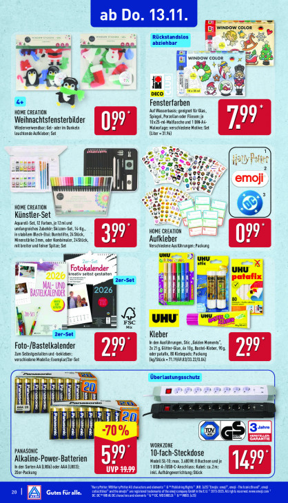Bitte beachten Sie, dass dieser Text automatisch generiert wird und möglicherweise Fehler enthältab Do. 13.11. TE DO) on =; HA ©: = Bi er: INDOW COLOR ® x B a x € fc: ® © ir Fensterfarben HOME CREATION Auf Wasserbasis: geeignet ür las, Spiegel, Porzellan oder Fliesen: je Weihnachtsfensterbilder 10x25-ml-Malflasche und 1 DIN-A4- 99 Wiederverwendbar; Gel- oder im Dunkeln Malvorlage; verschiedene Motive: Set leuchtende Aufkleber; Set (Liter =31.9) DV PN "2, SEK NT 7 Po messe 9 5 922. alfyraffer je Sfr re fe | SBEBER meren < 5 er #51 aeveaa mm s' 3 ! f tes, Yo emo) i zeen | fr: 9 188 ee ei FRE de 3] er HOME CREATION ° FA KE Künstler-Set a I Aquarell-Set, 12 Farben, je 12ml und Fx = umfangreiches Zubehör: Skizaen-Set, 14-1g.. HON ECR EATION in stabilem Blech-Etui; Buntstifte, 24 Stück, Minenstärke 3mm, oder Kombimaler, 24Stück, Aufkleber mit breiter und feiner Spitze; Set Verschiedene Ausführungen; Packung ie ern > Char ic EK Fotokalender 1 Ji au y ls ei 2026 kreativ selbst gestalten pe a | | | Aiel . os LS va; SEL a FSC ES RER Mix Kleber In den Ausführungen, Stic „Golden Moments”, Foto-/Bastelkalender 221, Glitter-Glue, 6x 109, Bastel-Kleber, 909, Zum Selbstgestalten und -bekleben; oder patafi, 80 Klebepads; Packung verschiedene Modelle; Exemplar/2er-Set (kg/Stück = 71.19/49.83/33.22/0.04) jn el ü] h | | Hi Hl j ERD | | Fi aM | | pes CU WORKZONE PANASONIC 99° 10-fach-Steckdose Alkaline-Power-Batterien Modell SL-10; max. 3.680; 8 Buchsen und je 99 In den Sorten AA (LRO6) oder AAA (LRO3); 1USB-A-/USB-C-Anschluss; Kabel: ca.2m; 14 Mer-Packung UVP 49.99 inkl Aufhängevorrichtung Stück Mar ERROL BE M En HE) elcaricBran at 20 | Gutes für coll ALDCch ra Ei trade A En HELD: 192] Dn N Dr com